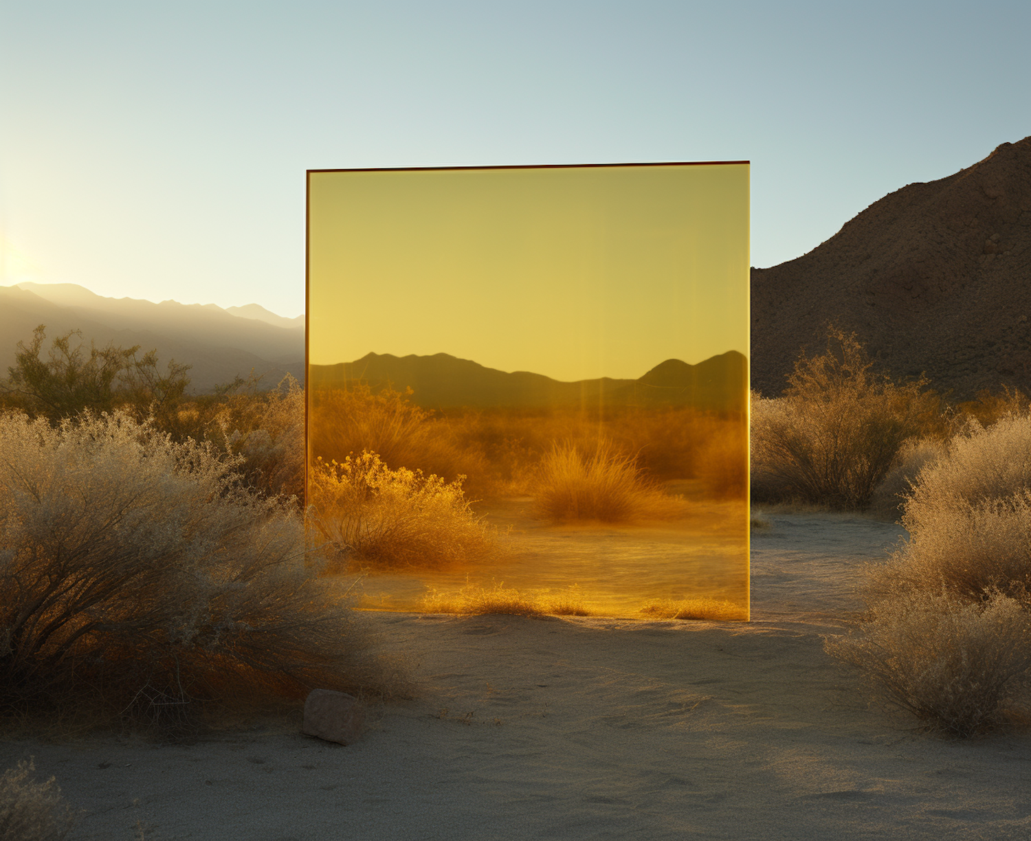 A surreal desert scene with a large yellow panel reflecting the landscape, creating a unique visual effect under the warm sunlight.