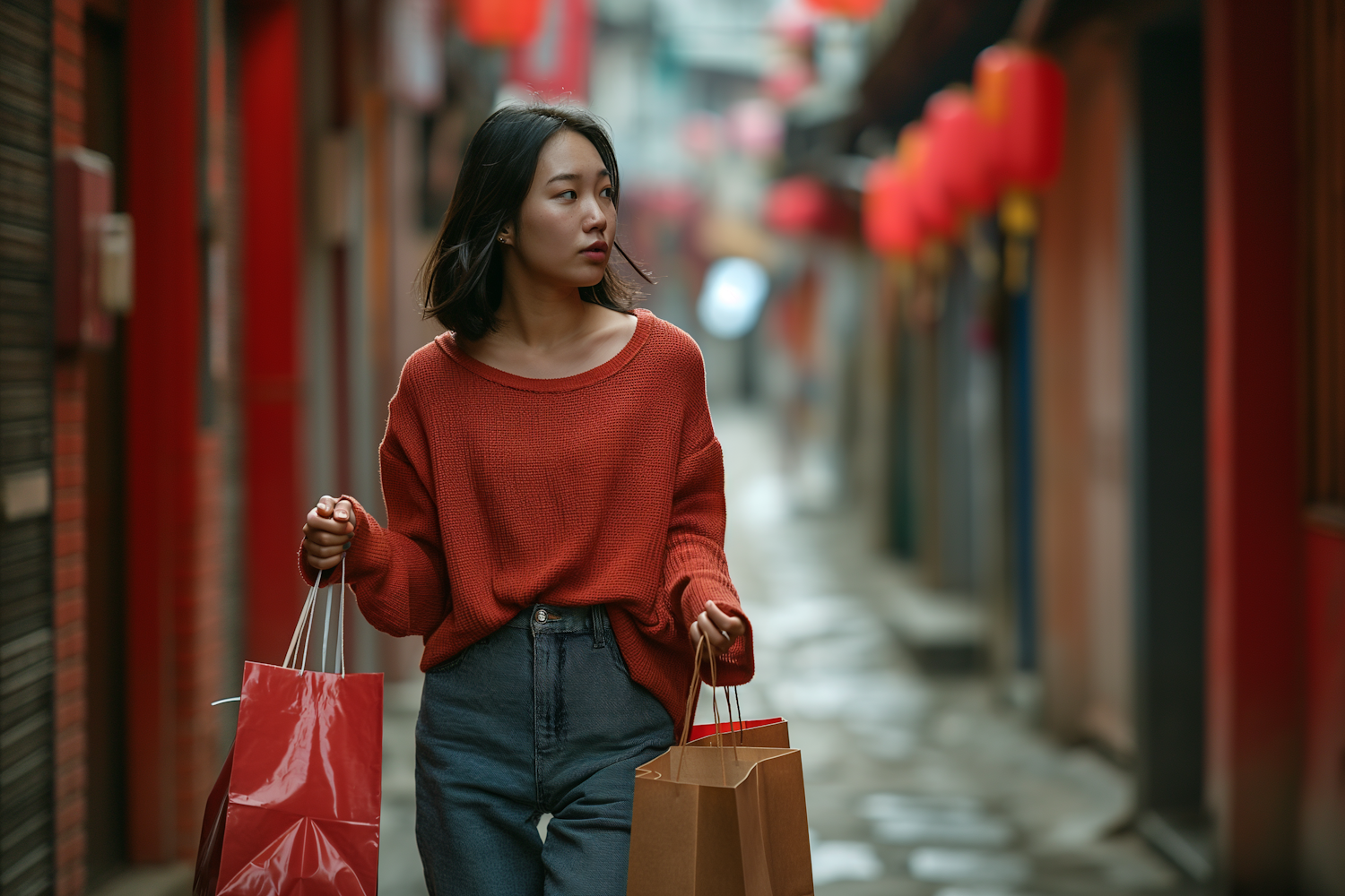 Asian woman in red sweater walking with shopping bags on a lantern-lined street, capturing a moment of urban exploration.