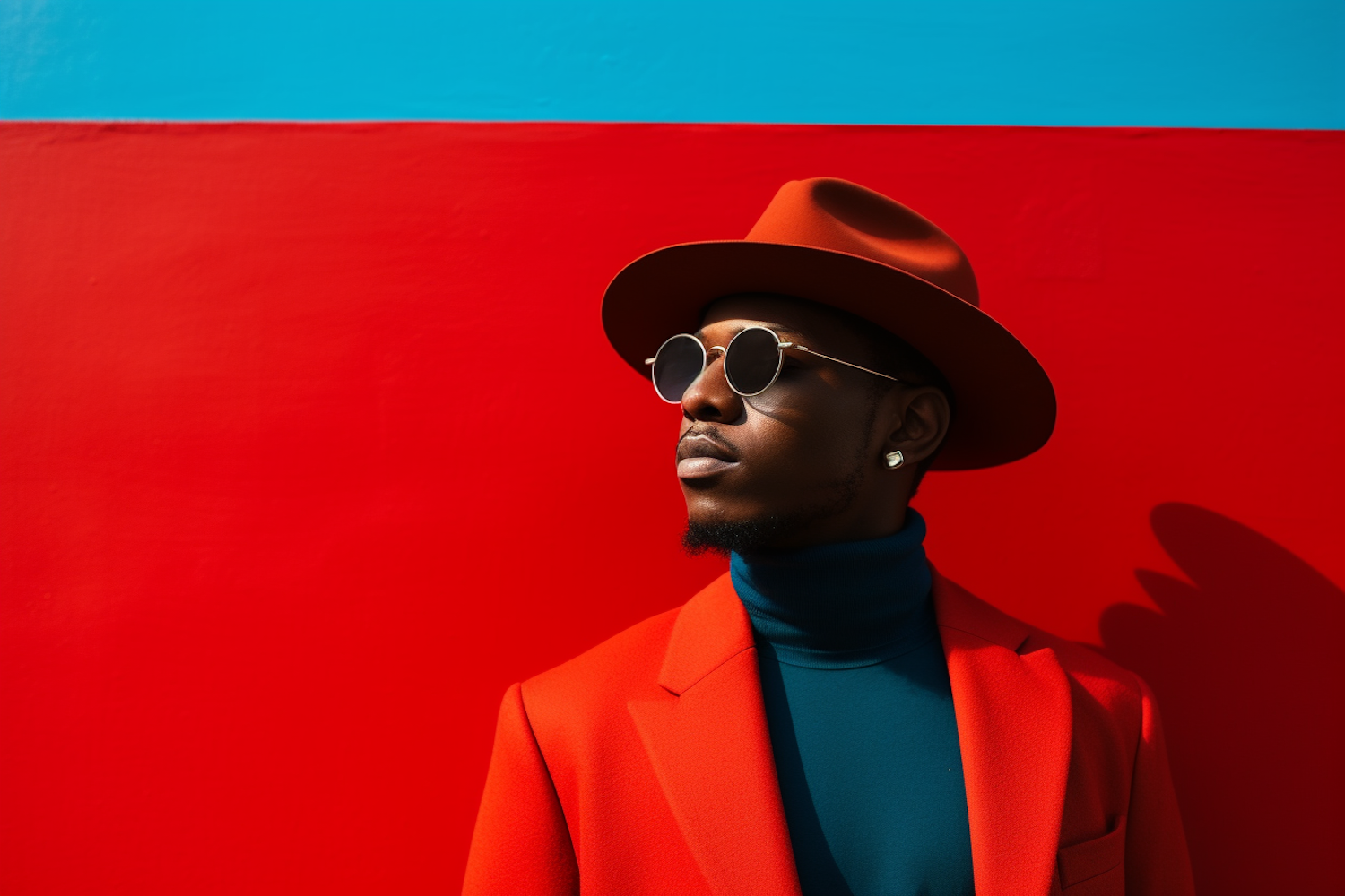 Stylish man in red suit and hat against vibrant red and blue background, wearing sunglasses and exuding confidence.