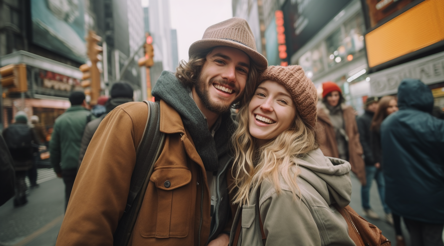 Smiling couple in winter attire enjoying a bustling city street with bright billboards and a lively crowd.