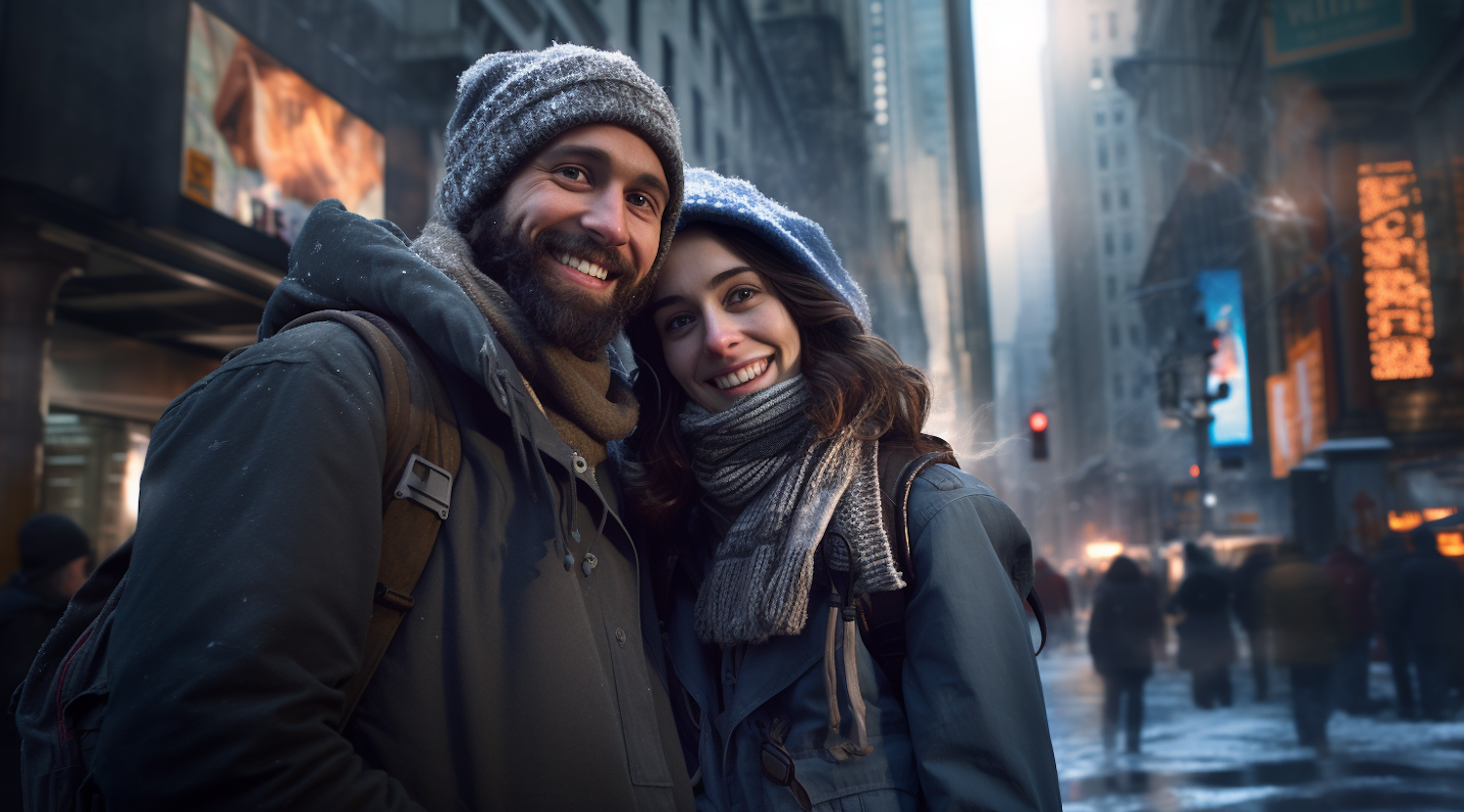 Happy couple in winter attire smiling on a bustling city street, surrounded by urban lights and a snowy atmosphere.