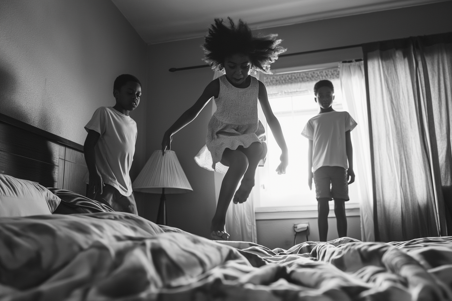 Black-and-white photo of three children playing on a bed, with a girl mid-jump and two boys watching in a cozy, naturally lit bedroom.