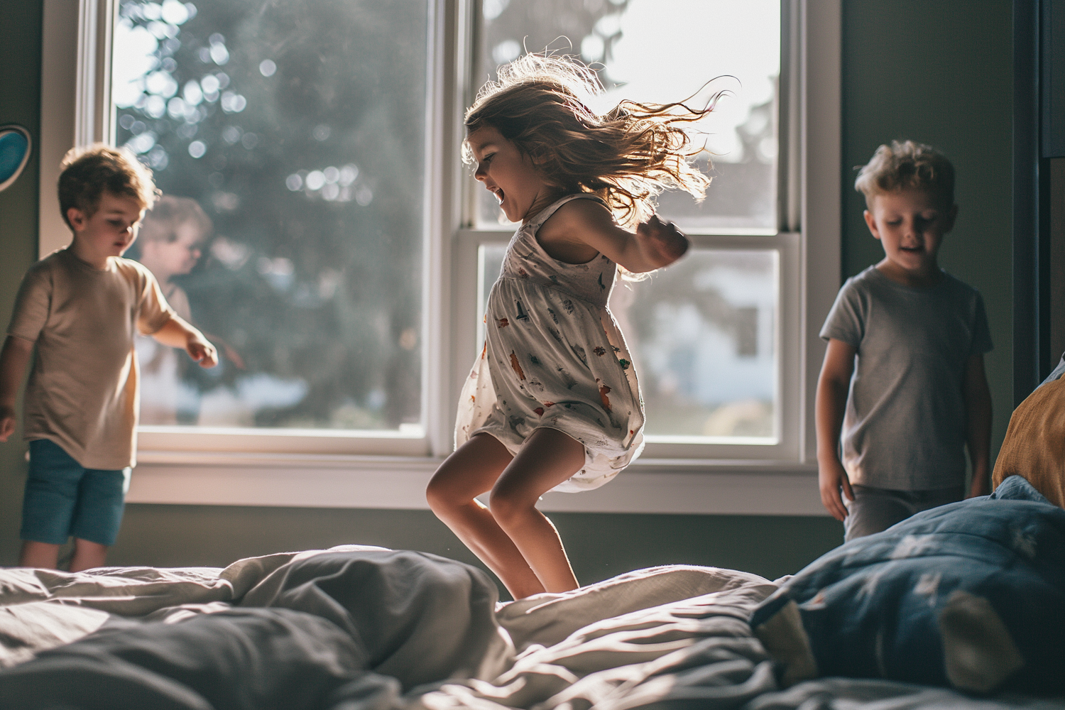 Three children joyfully jumping on a bed in a sunlit room, capturing a moment of playful delight and carefree fun.