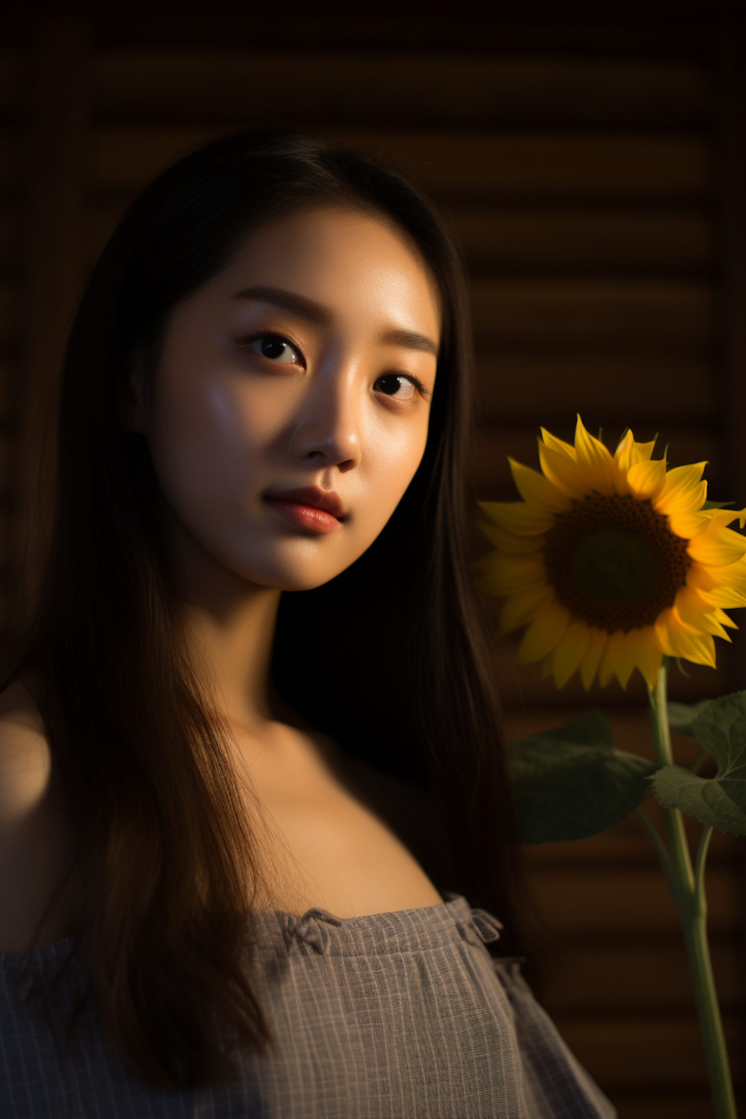 A serene portrait of a young Asian woman with a sunflower, featuring soft lighting and warm tones.