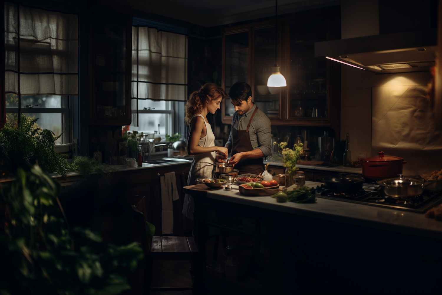 A couple cooking together in a cozy kitchen, surrounded by fresh ingredients and warm lighting, creating an intimate atmosphere.