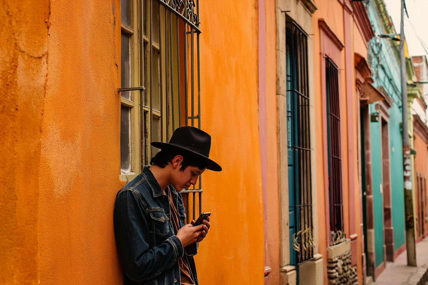 Young man in a black hat and denim jacket leans against a colorful wall, engrossed in his phone on a vibrant street.
