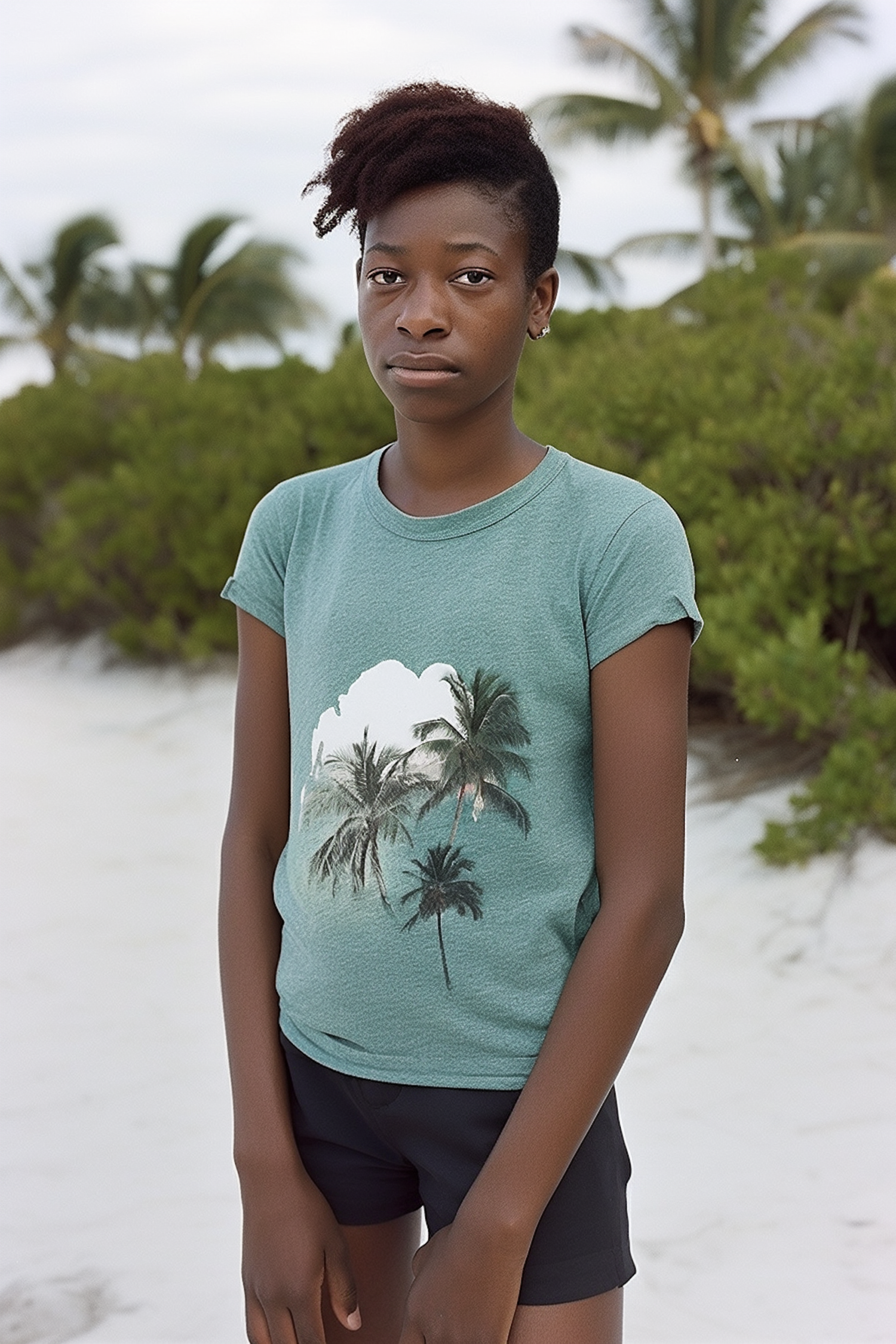 Young girl on a beach with palm trees, wearing a green t-shirt and black shorts, standing on white sand with lush greenery around.