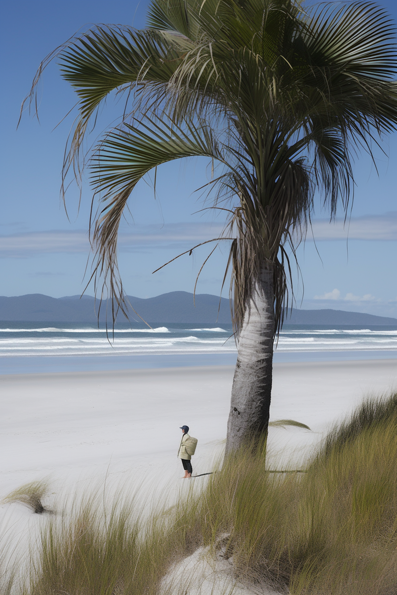Serene beach scene with a palm tree, person gazing at ocean, and distant hills under a clear blue sky.