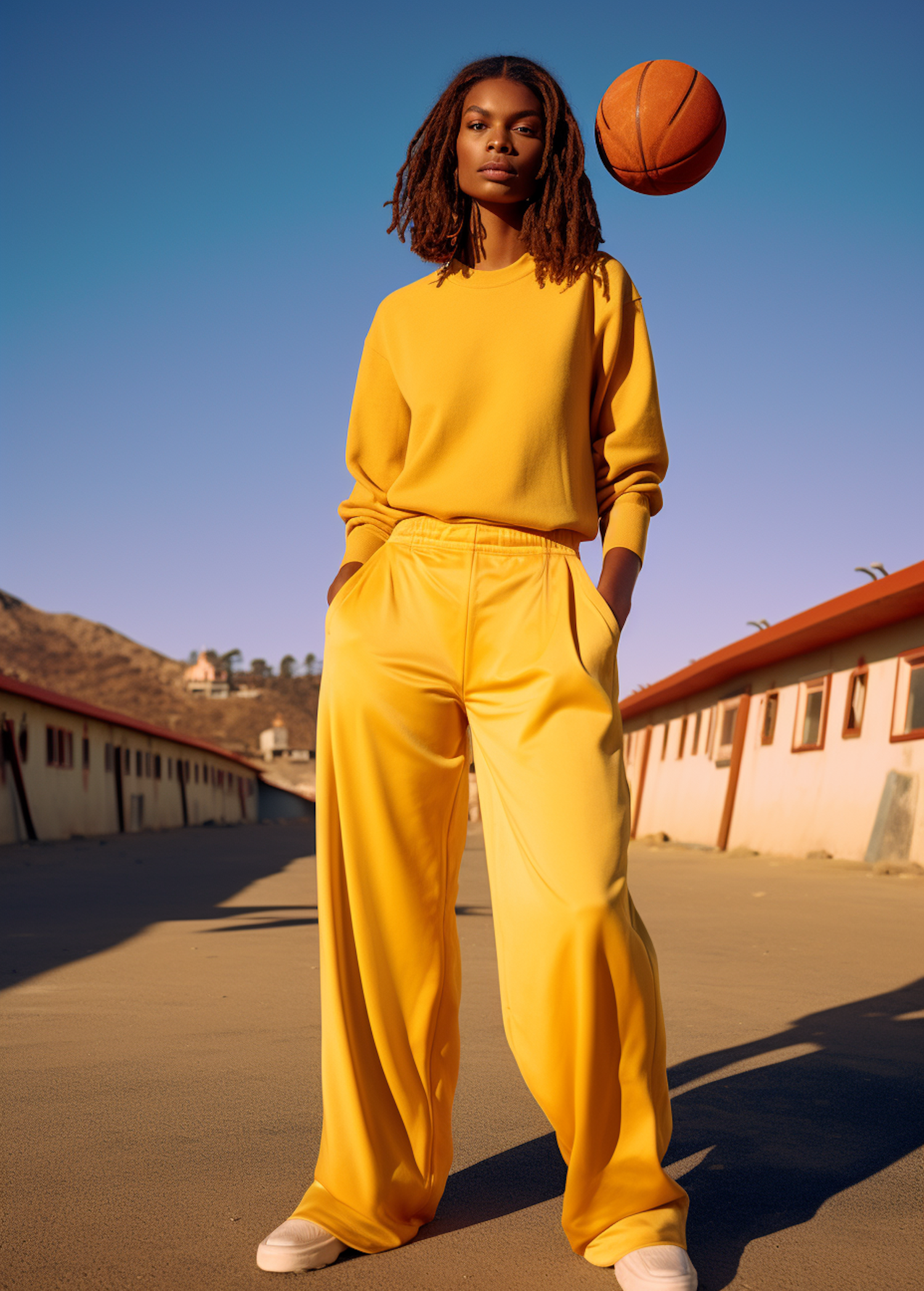 Stylish woman in yellow outfit with a basketball, set against a clear blue sky and urban backdrop. Vibrant and dynamic fashion scene.
