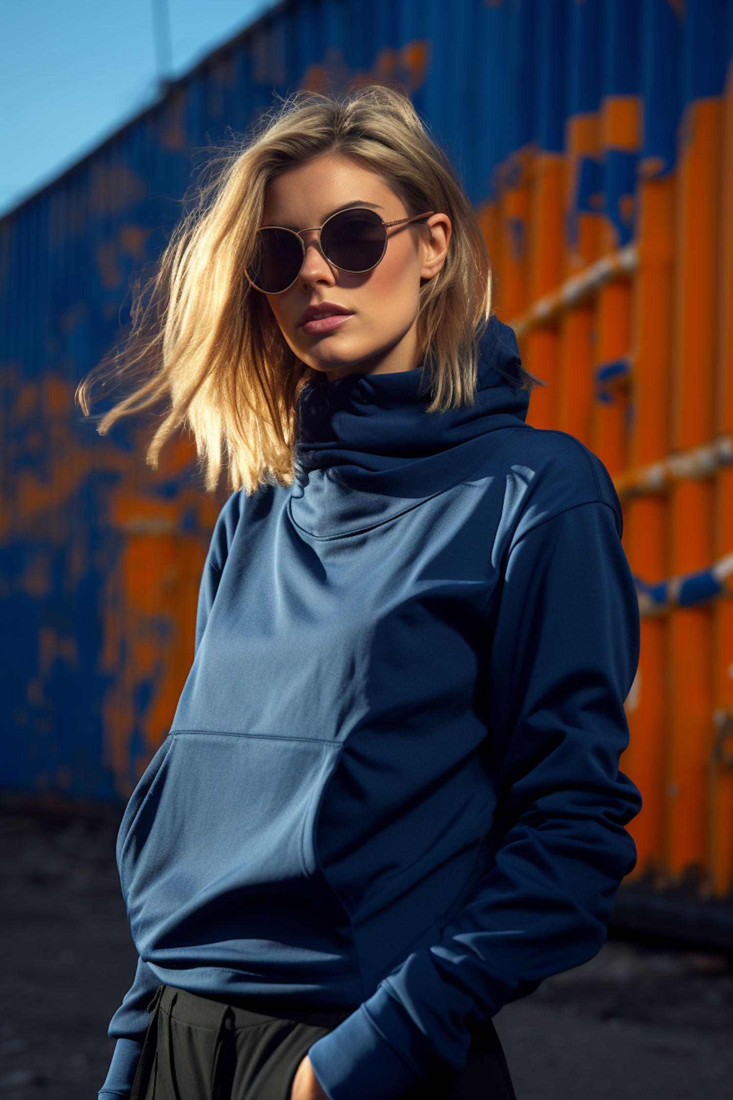 Stylish woman in sunglasses and blue hoodie against a vibrant shipping container backdrop, exuding urban chic.