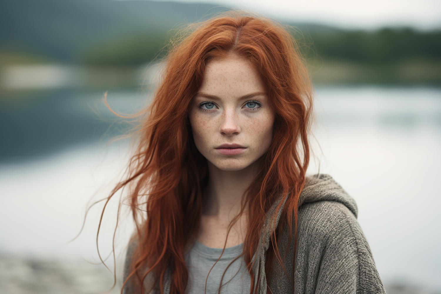 Portrait of a young woman with red hair and blue eyes, standing by a serene lakeside, exuding a calm and introspective vibe.
