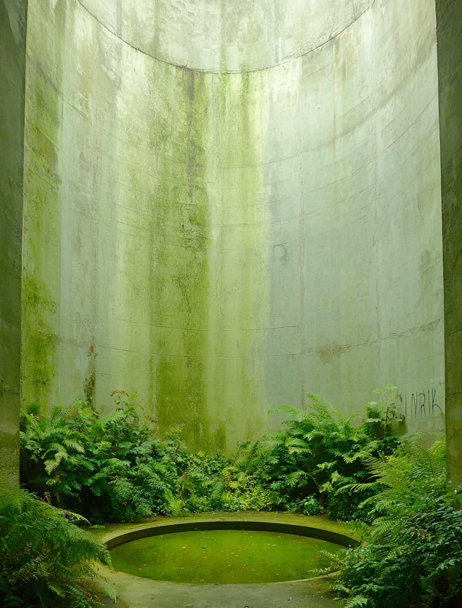 An overgrown concrete structure with mossy walls and a central green-water basin surrounded by vibrant vegetation.