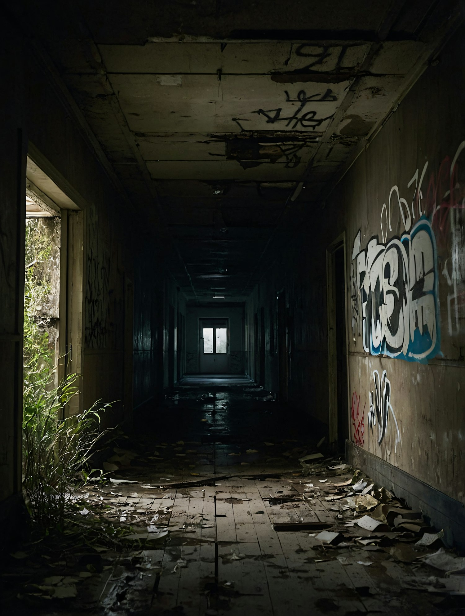 Explore an eerie, graffiti-covered abandoned hallway with overgrown plants and debris, capturing a haunting atmosphere of decay.
