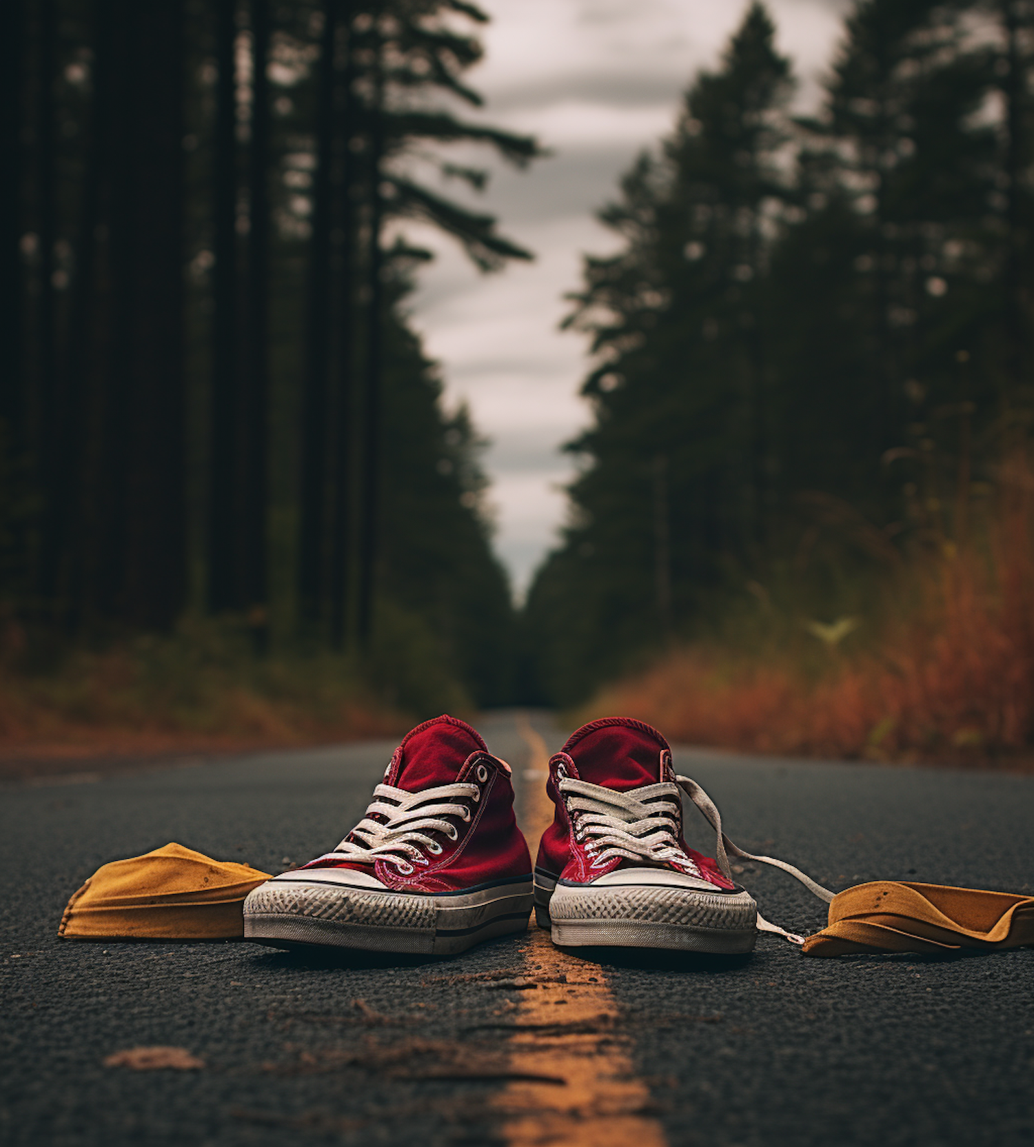 Red sneakers and a yellow cap on an empty road surrounded by tall trees, creating a mysterious and solitary atmosphere.