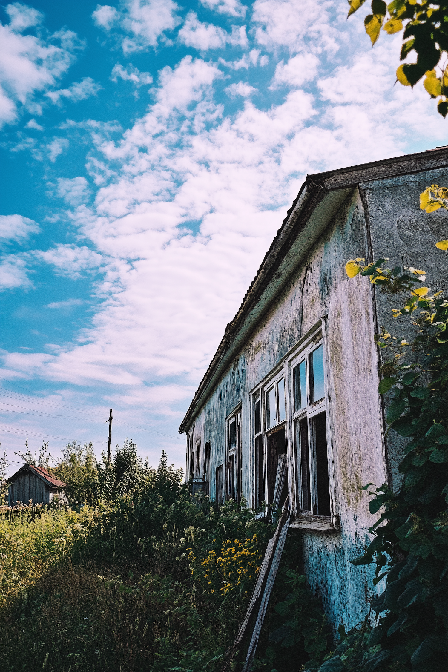 A weathered, abandoned house with broken windows surrounded by overgrown plants under a vibrant blue sky with scattered clouds.
