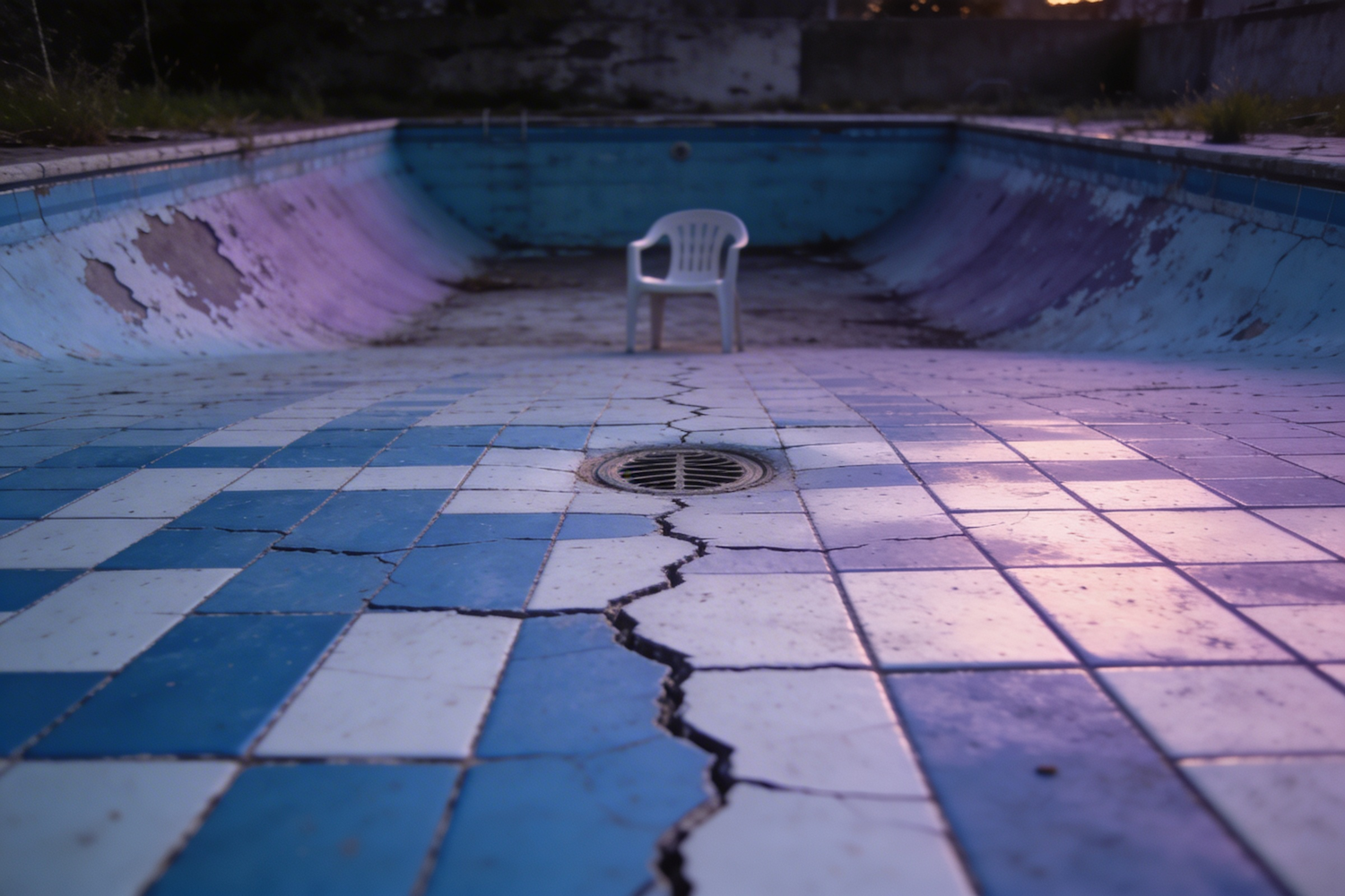 An empty swimming pool at dusk, cracked tiles dominating foreground, a lone plastic chair half-cropped beyond the drain, lavender light sinking unevenly, atmosphere suspended between abandonment and quiet dignity.