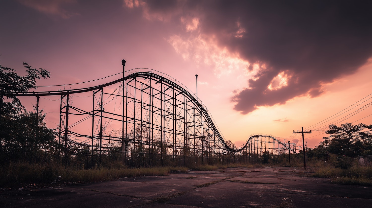 A hauntingly beautiful abandoned roller coaster at sunset, surrounded by overgrown vegetation and a desolate, cracked pavement.