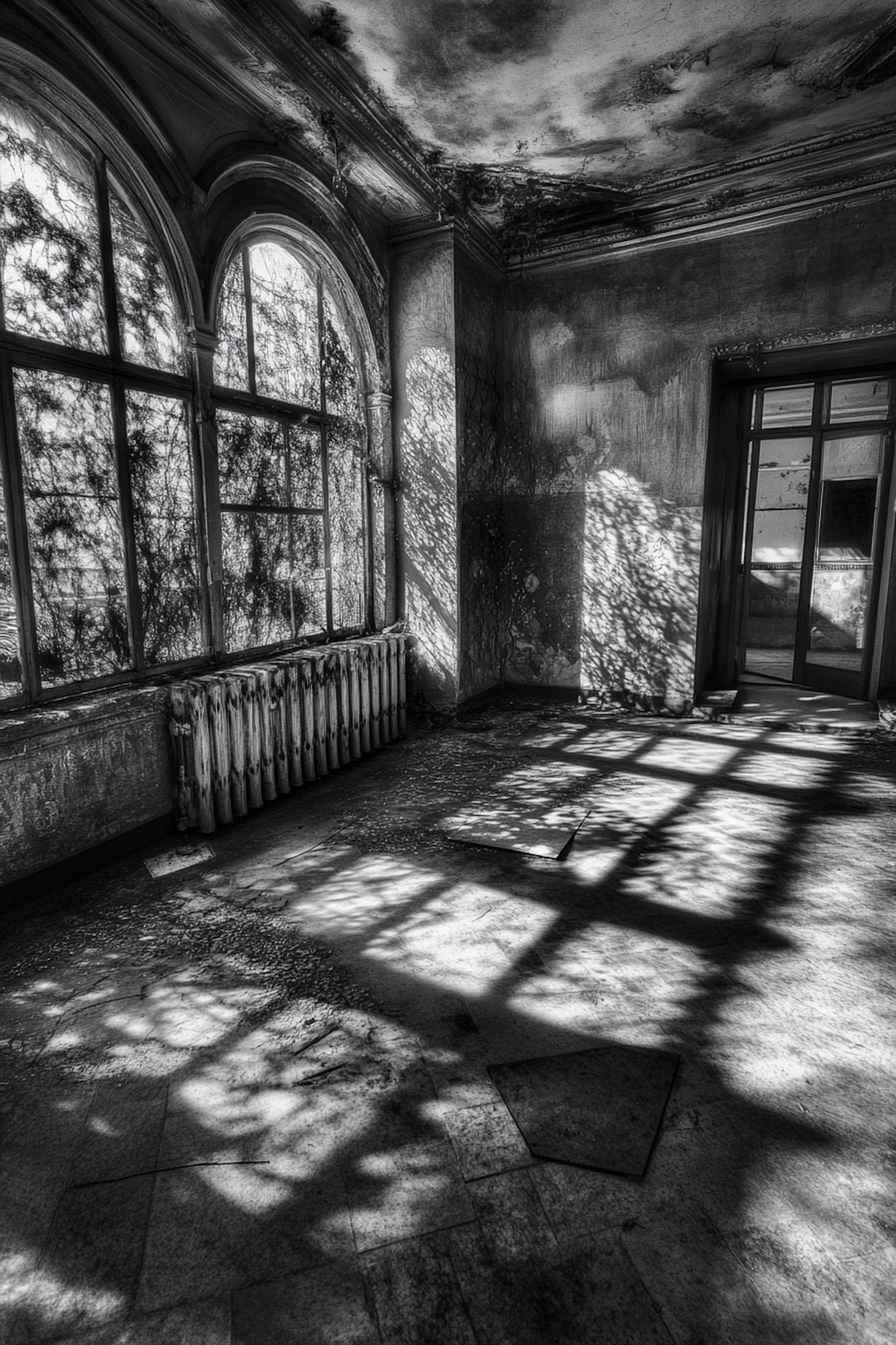 Abandoned room with arched windows and vine shadows, creating an eerie atmosphere with dramatic light and shadow play.