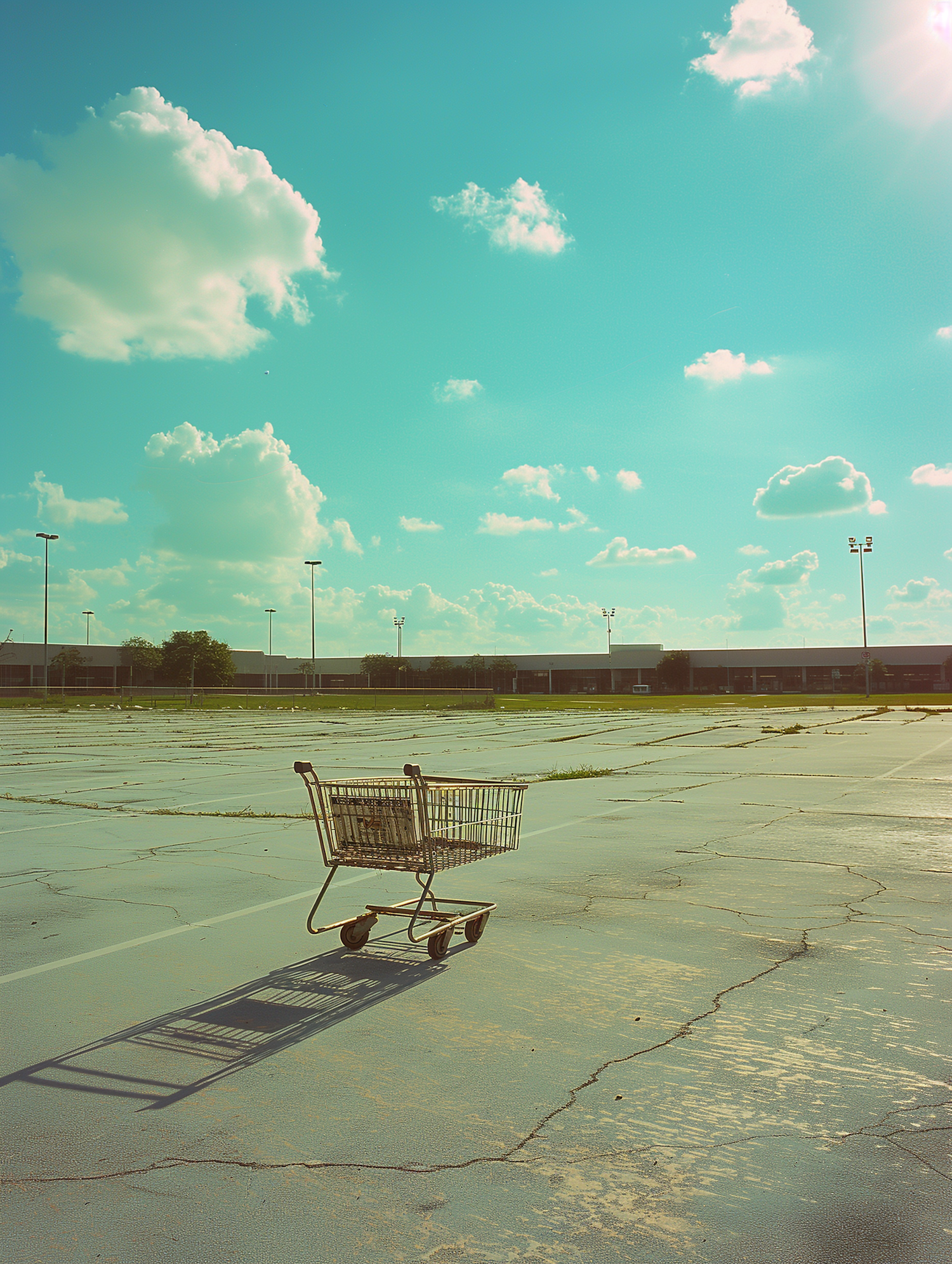 A solitary shopping cart in an empty, cracked parking lot under a bright blue sky with fluffy clouds, evoking a sense of solitude.