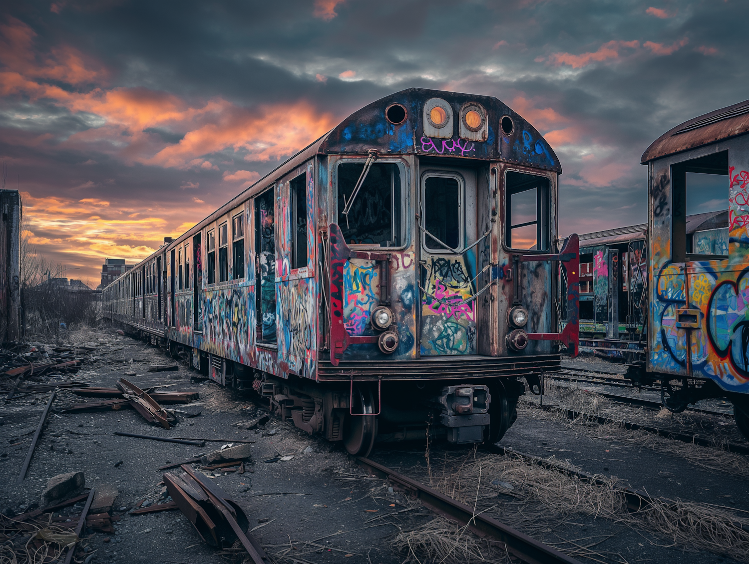 Abandoned graffiti-covered train on rusty tracks under a dramatic sunset sky, surrounded by debris and overgrown grass.