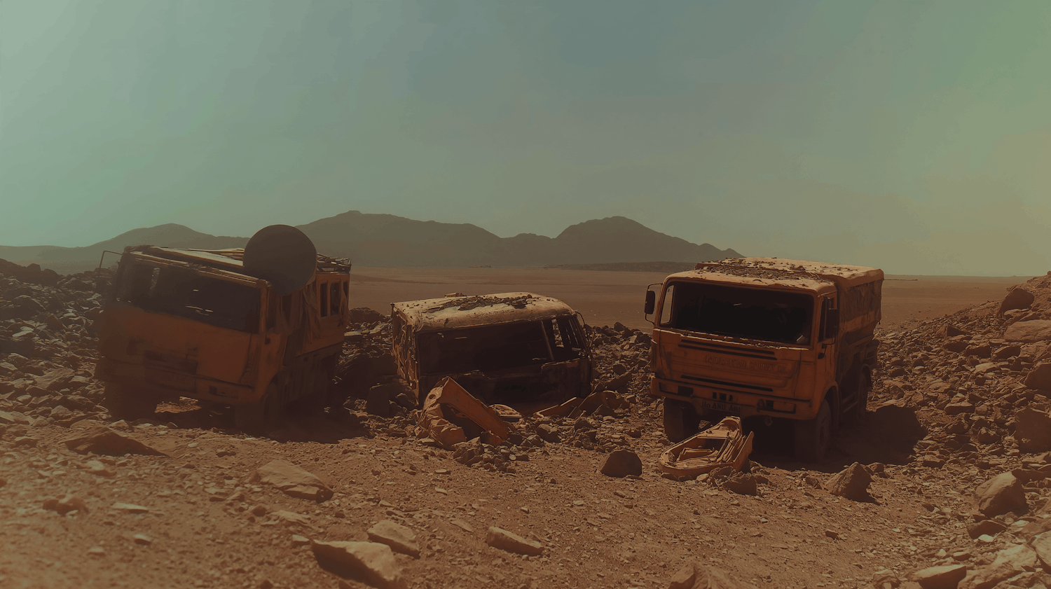 Three abandoned yellow trucks in a rocky desert with distant mountains under a hazy, sepia-toned sky, evoking a sense of desolation.