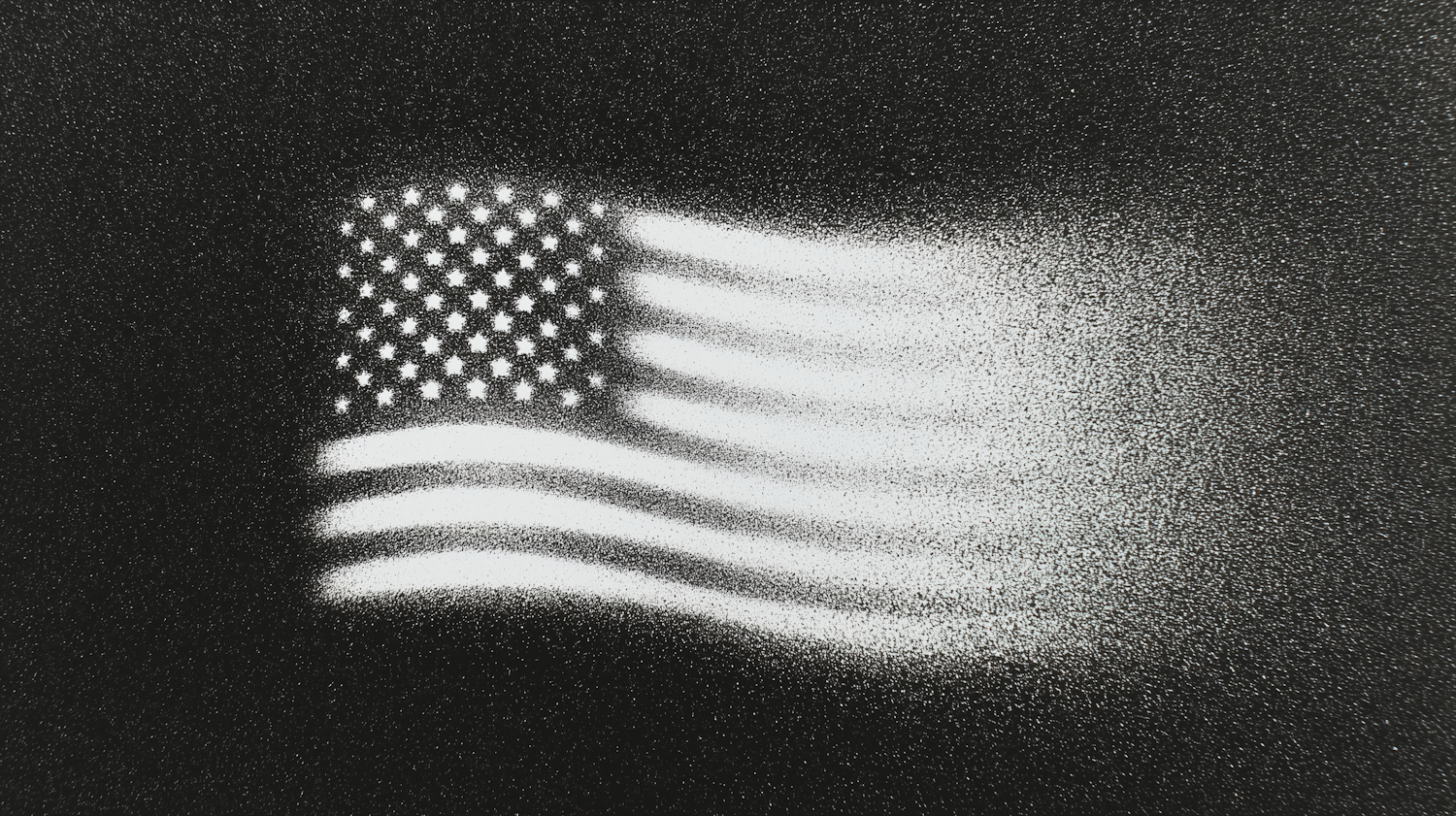 Stylized American flag in black and white with a spray paint effect, featuring stars and stripes fading into a textured black background.