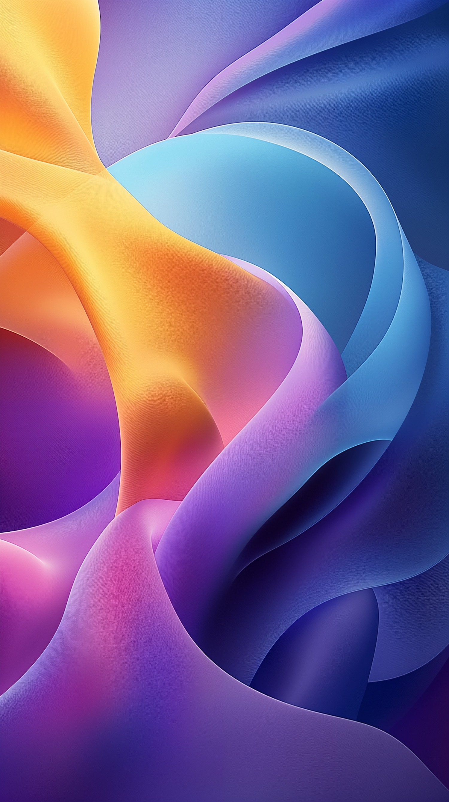Vibrant abstract design with flowing shapes in orange, blue, purple, and pink, creating a dynamic and fluid appearance.