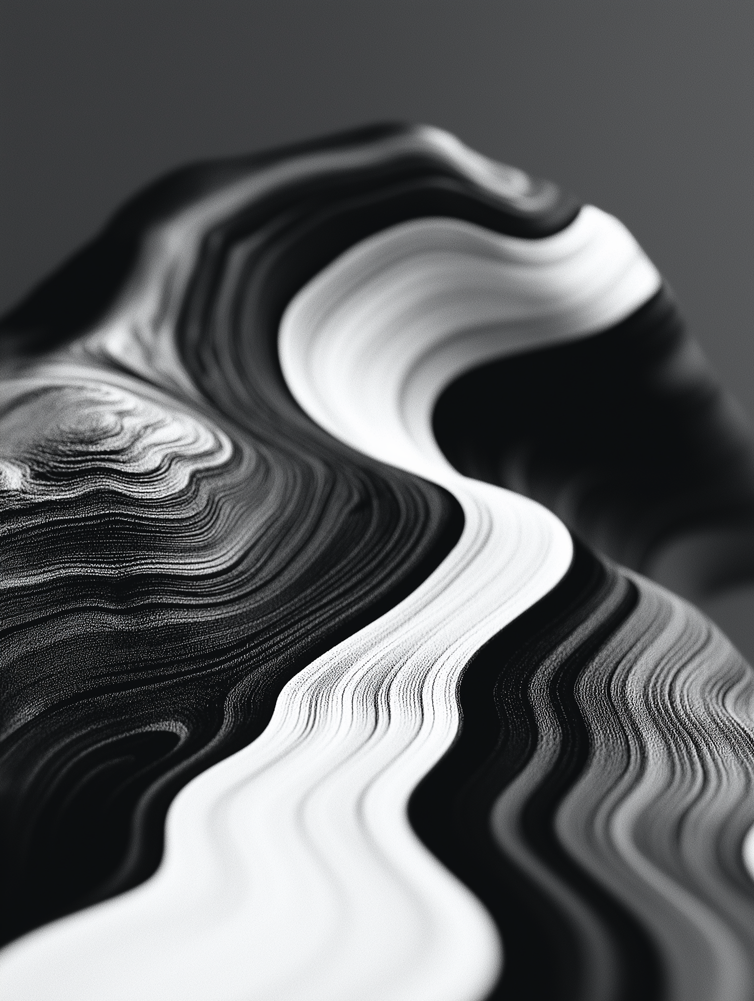 Abstract black and white wavy layers resembling geological strata or flowing fabric, creating a dynamic and textured visual effect.