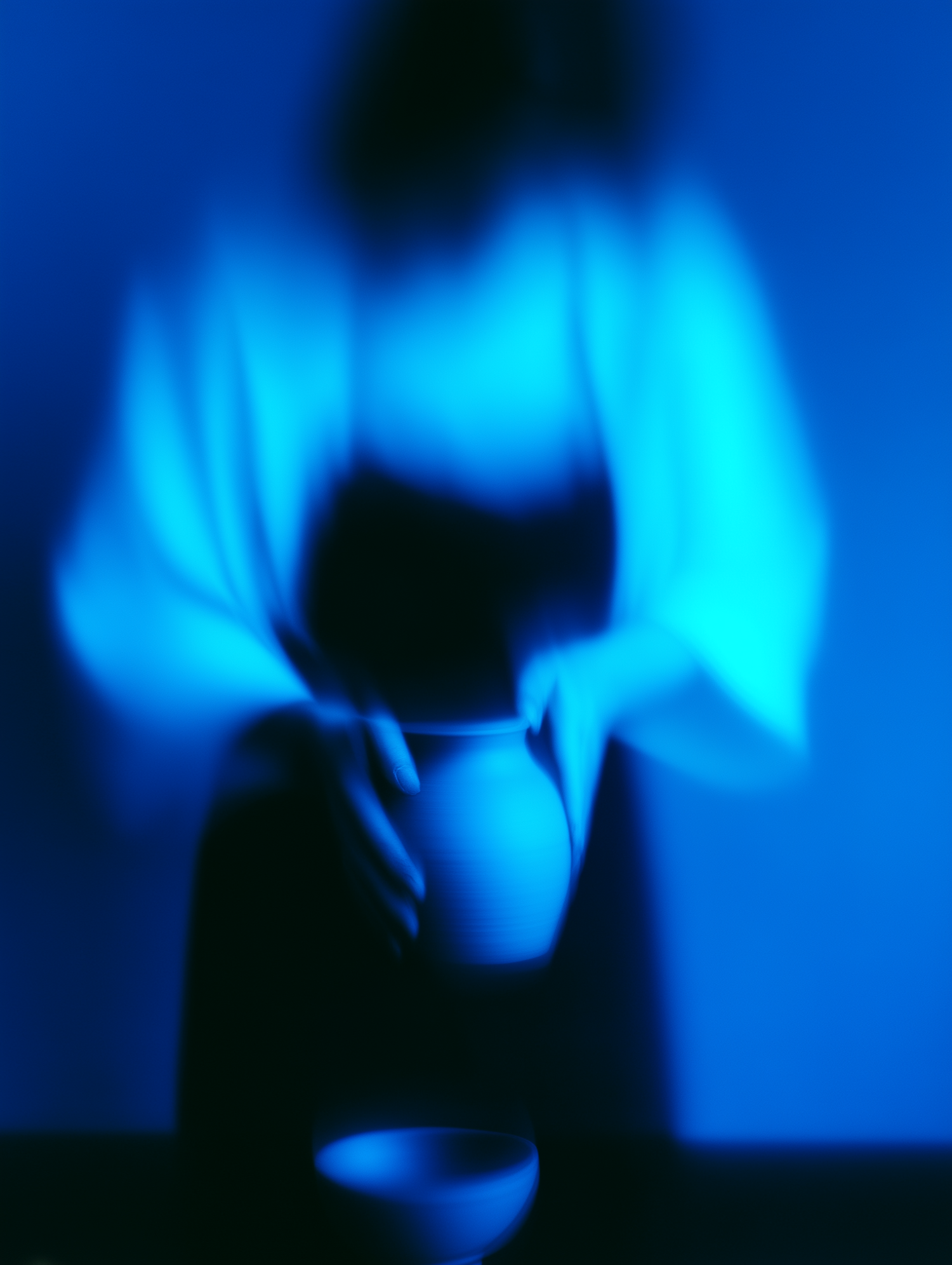 Abstract blue-lit scene of a person holding a vase above a bowl, creating a mysterious and artistic atmosphere.