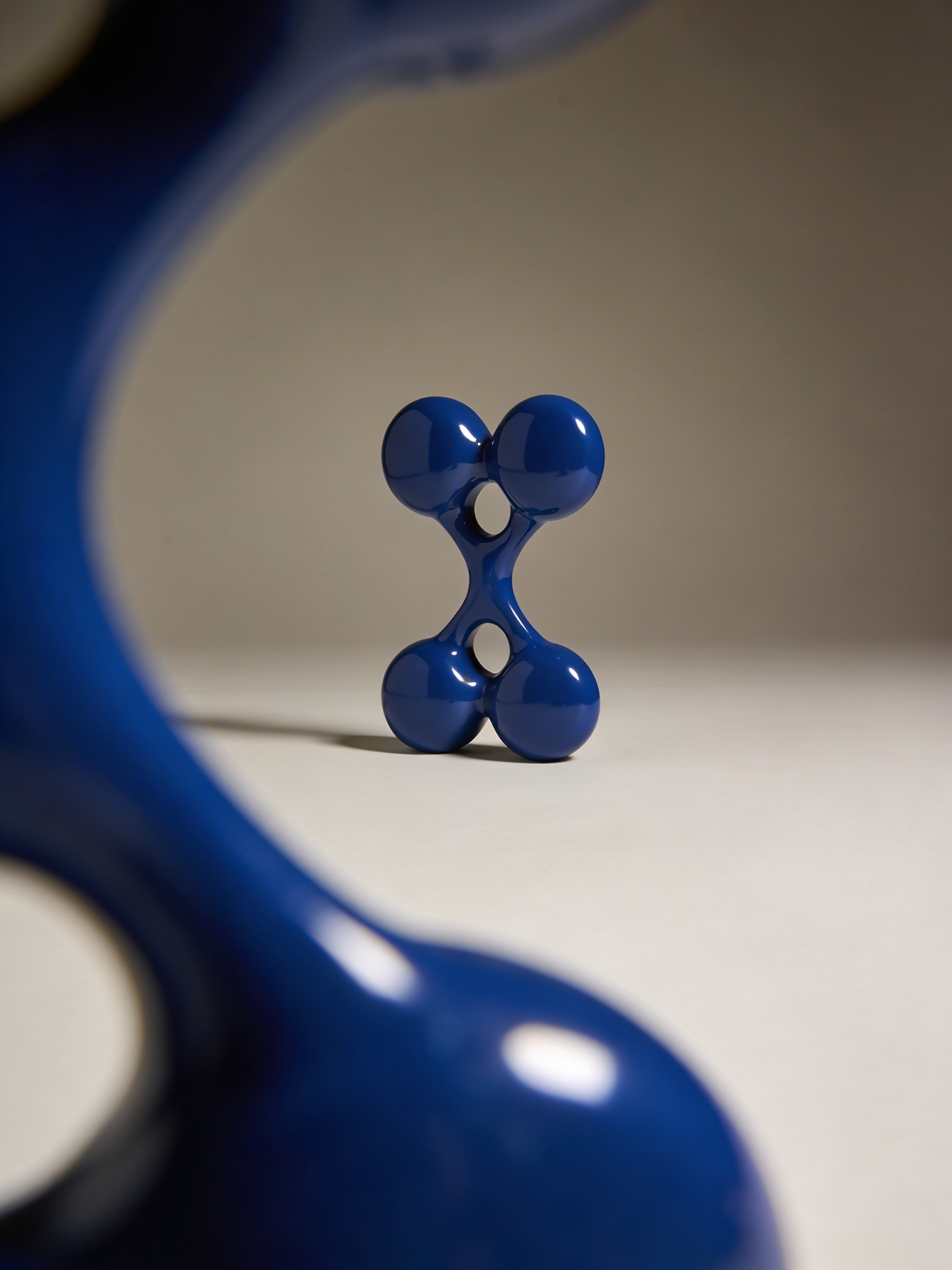 A glossy blue abstract sculpture with interconnected spheres, set against a neutral background, showcasing modern design and vibrant color.