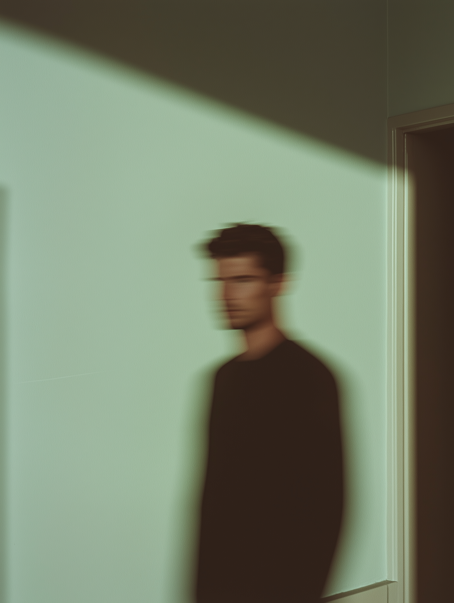 Blurred image of a person against a light green wall, creating an abstract, dreamy effect with shadows and minimal background.