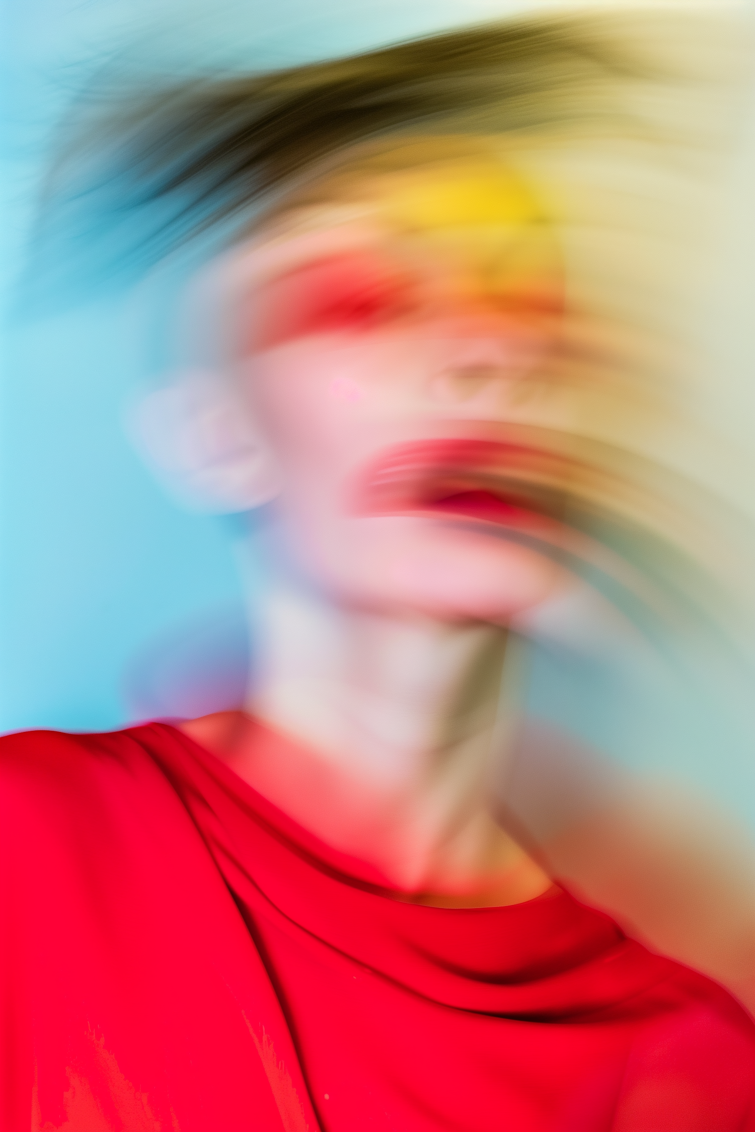 Abstract blurred portrait with vibrant red clothing and colorful smears on a soft blue background, creating a surreal and dynamic effect.
