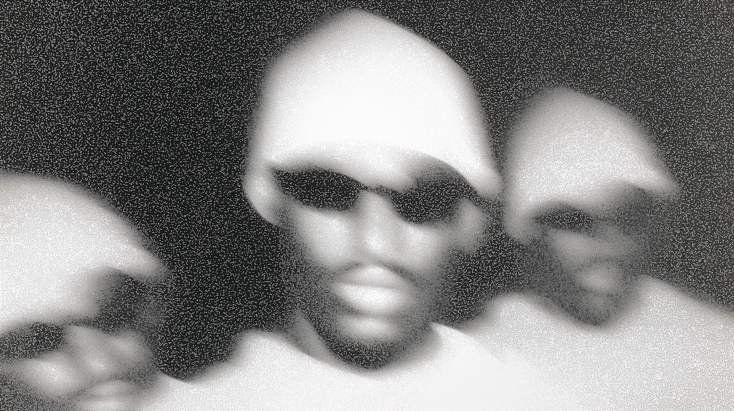 Grainy abstract image of three blurred figures in white head coverings and sunglasses, set against a dark background.