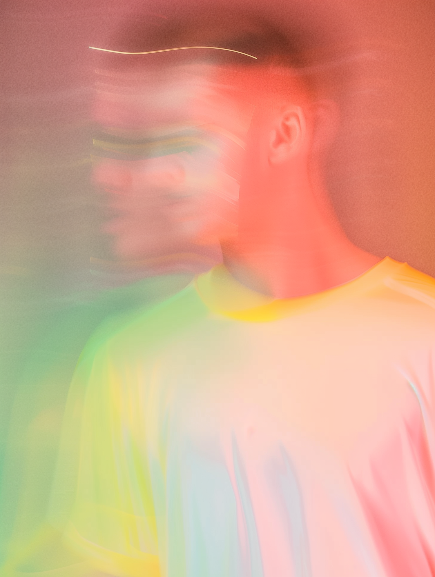 Abstract image of a blurred person in vibrant pink, green, and yellow tones, creating a dreamy and surreal visual effect.