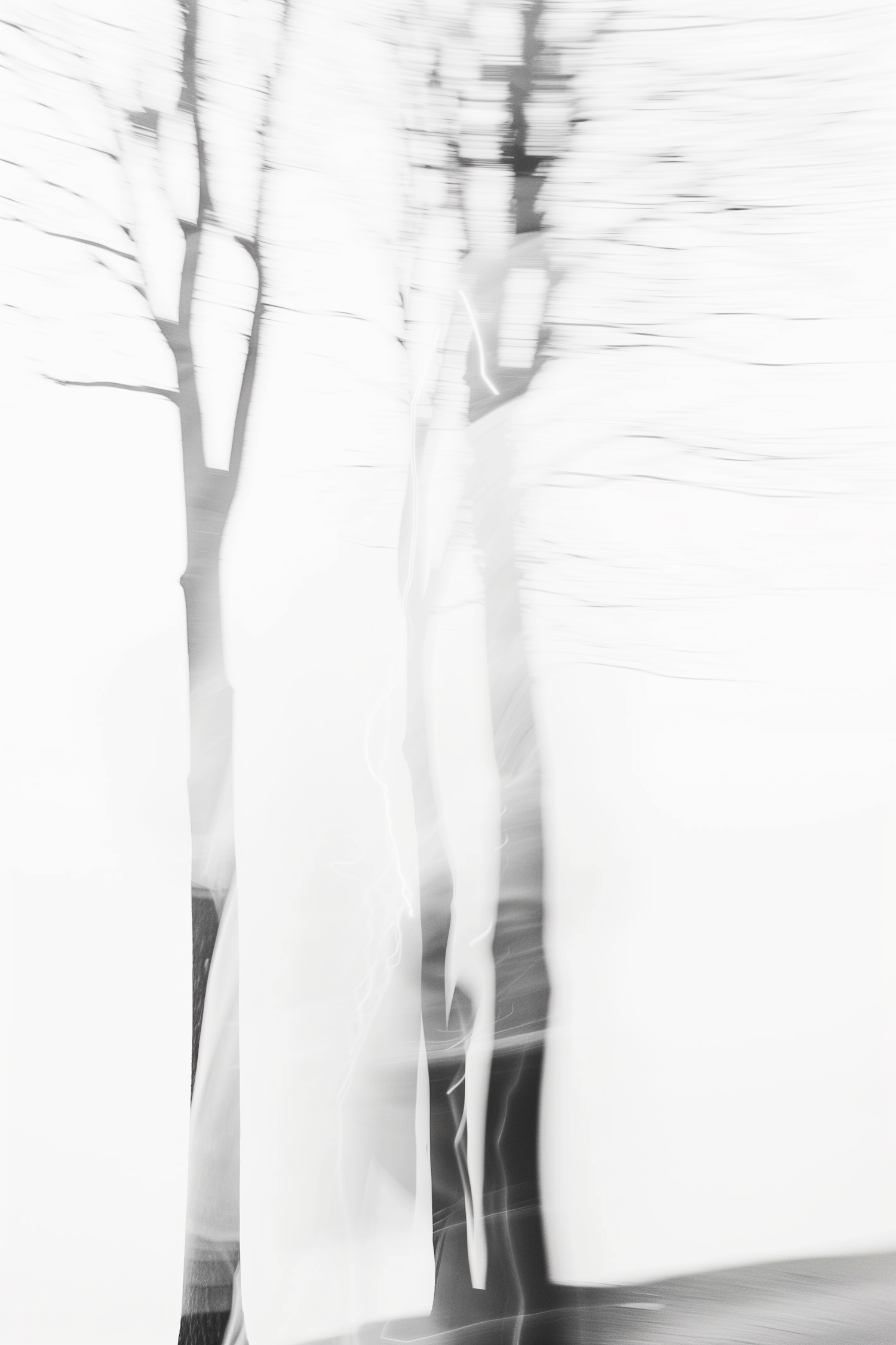 Abstract black-and-white image of blurred leafless trees with motion effects, creating a surreal and dreamlike atmosphere.