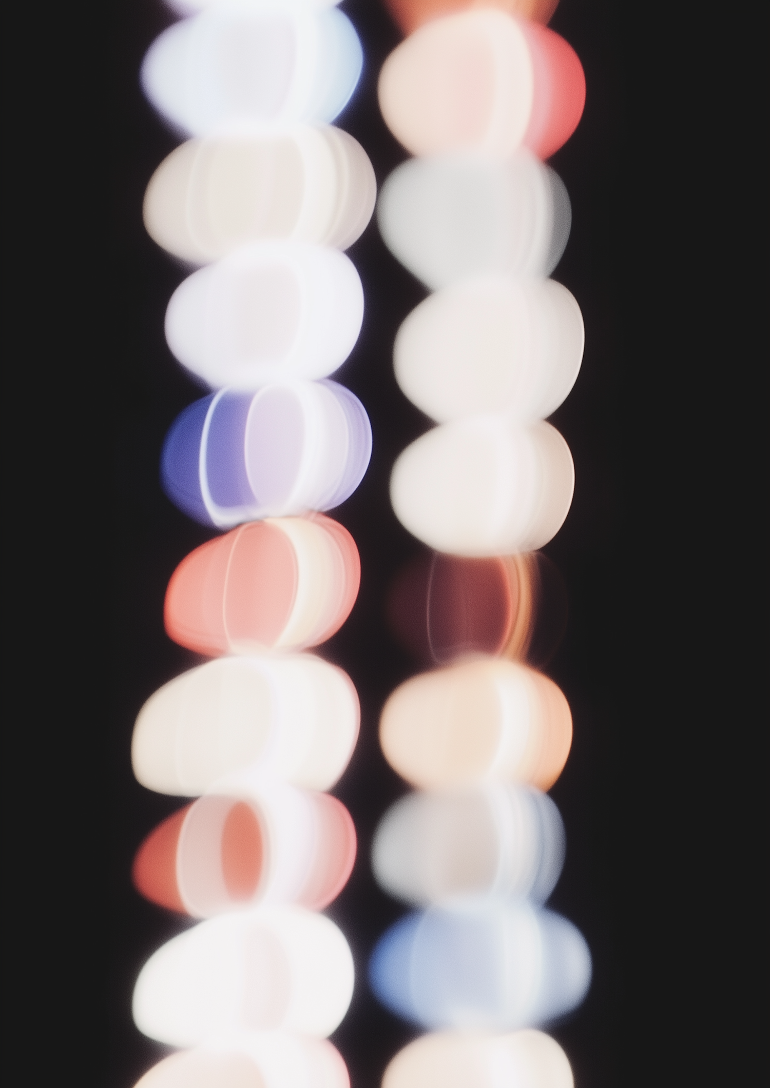 Abstract bokeh lights in vertical rows with soft white, red, and blue hues on a black background, creating a dreamy aesthetic.
