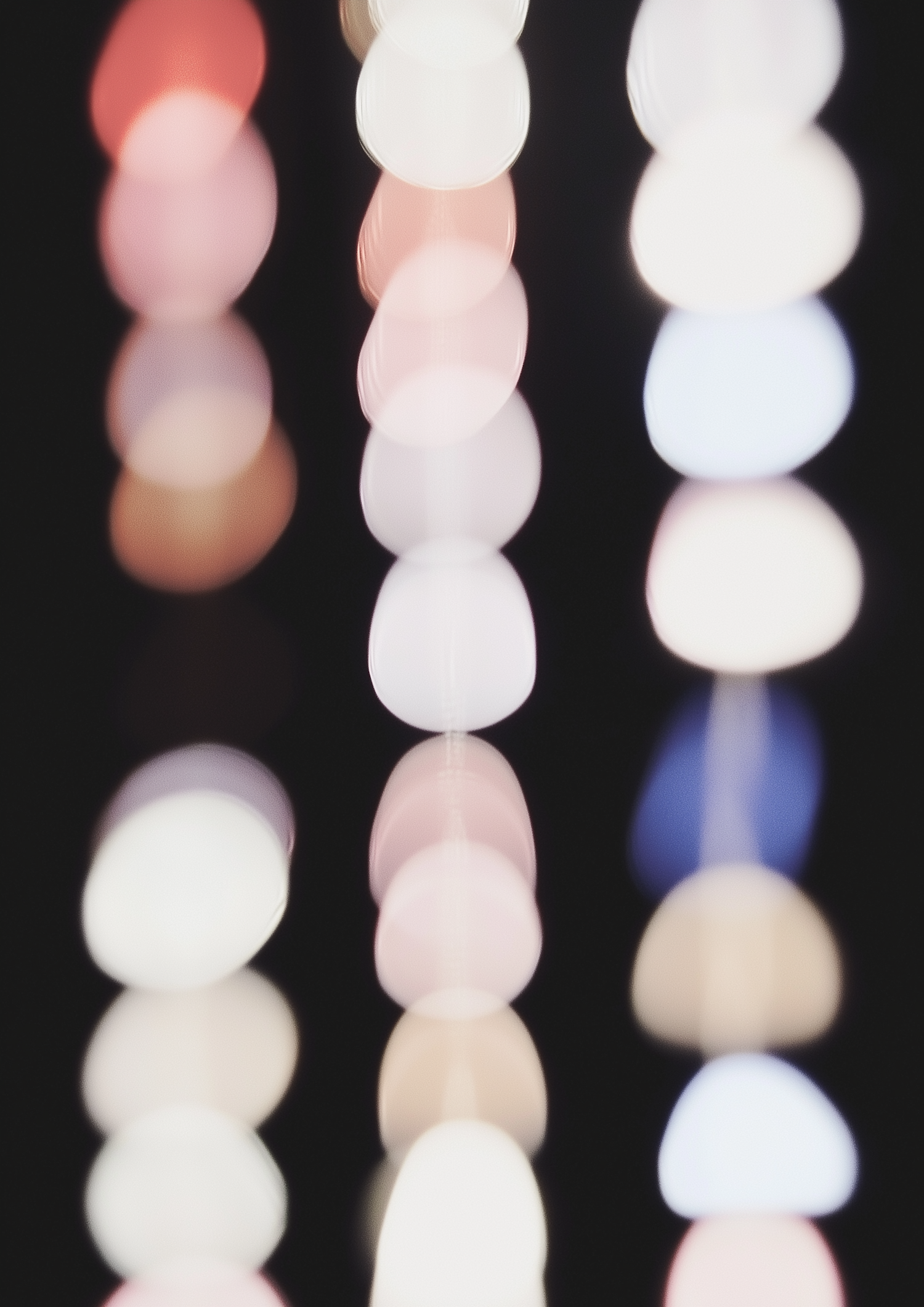 Abstract bokeh lights in vertical lines with warm and cool tones on a dark background, creating a dreamy and minimalistic vibe.