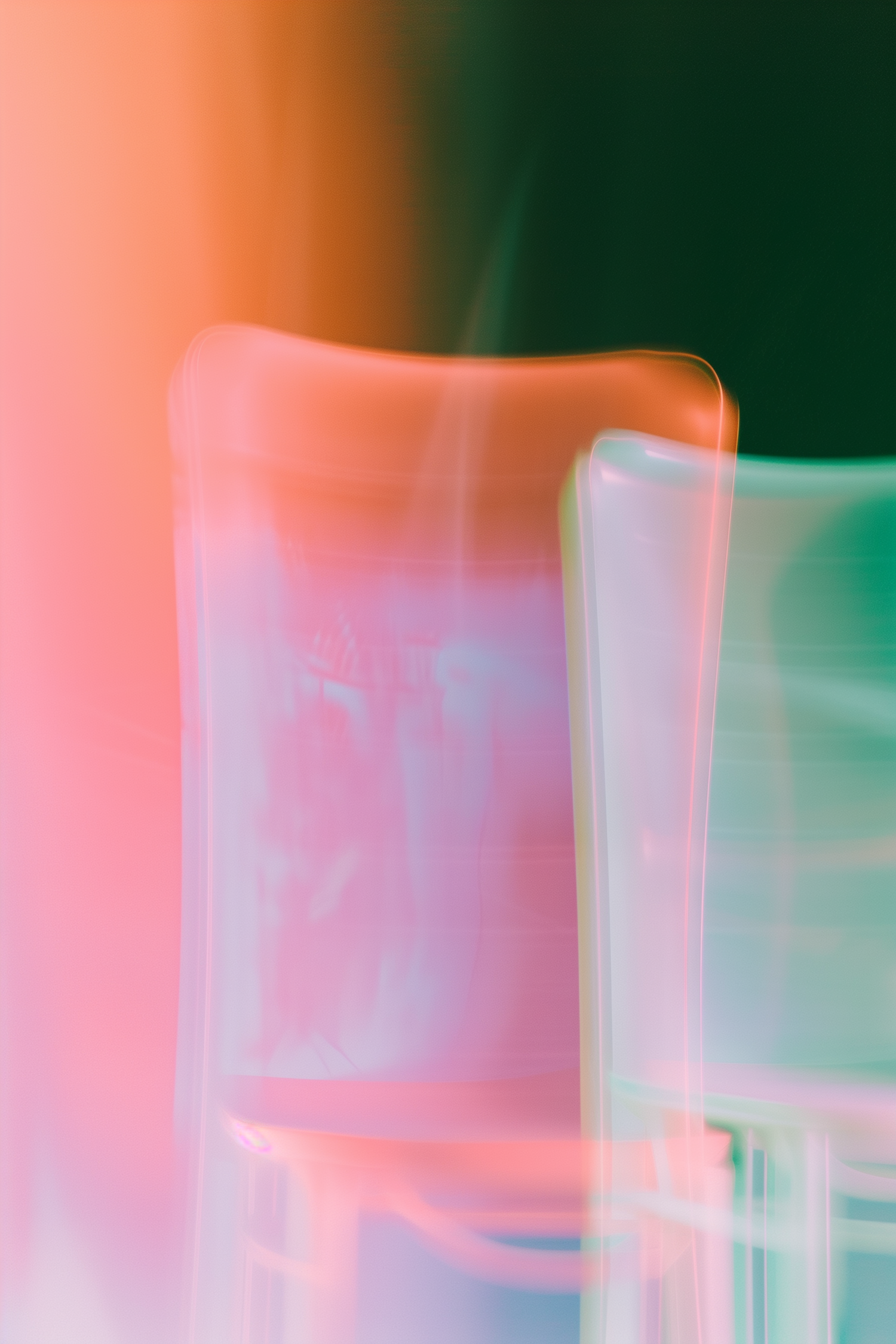 Abstract art with blurred pastel shapes in pink, orange, and green tones, creating a dreamy, layered effect against a dark background.