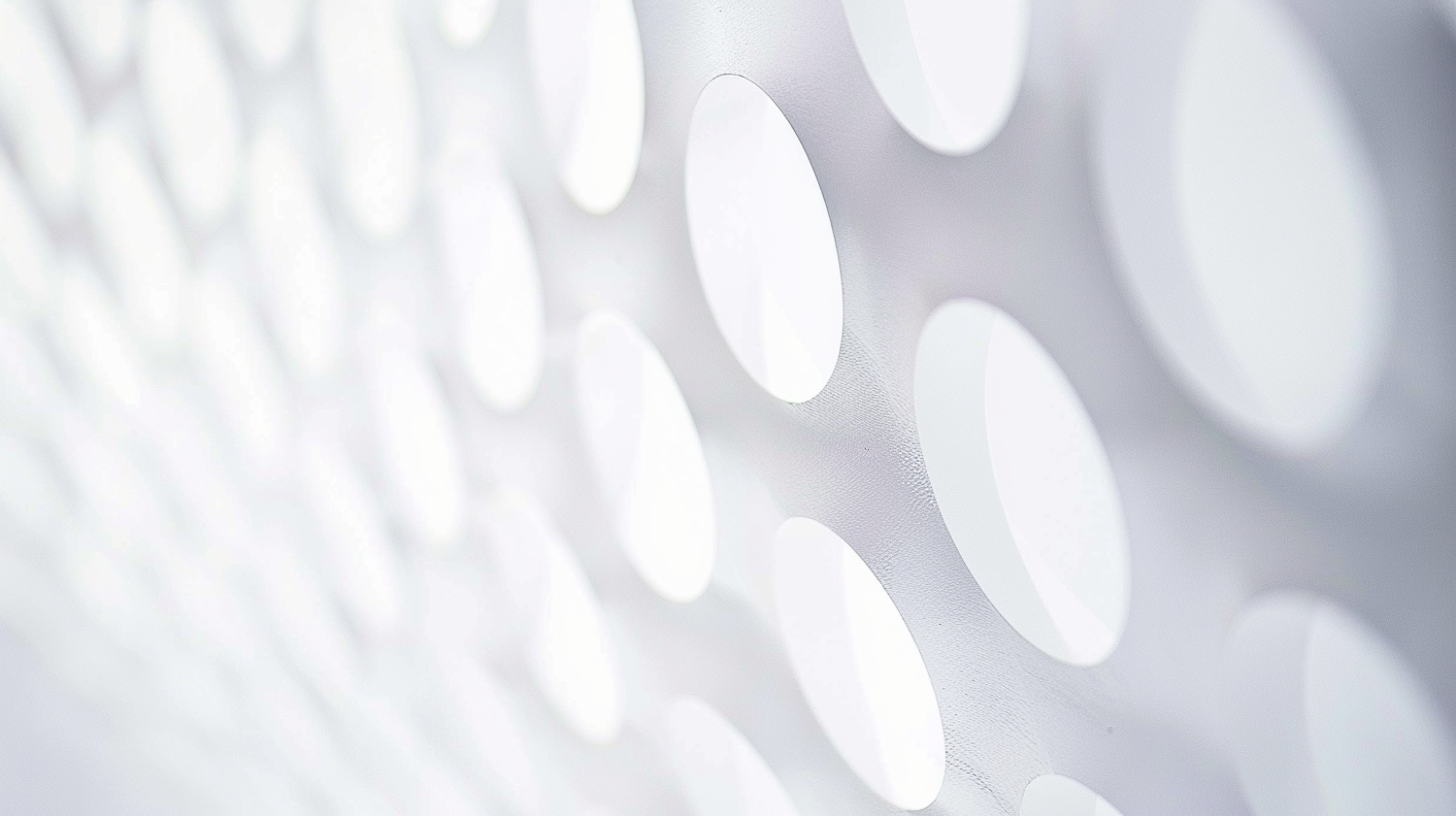 Close-up of a white perforated surface with circular holes, creating a diagonal pattern. Soft lighting enhances the texture and depth.
