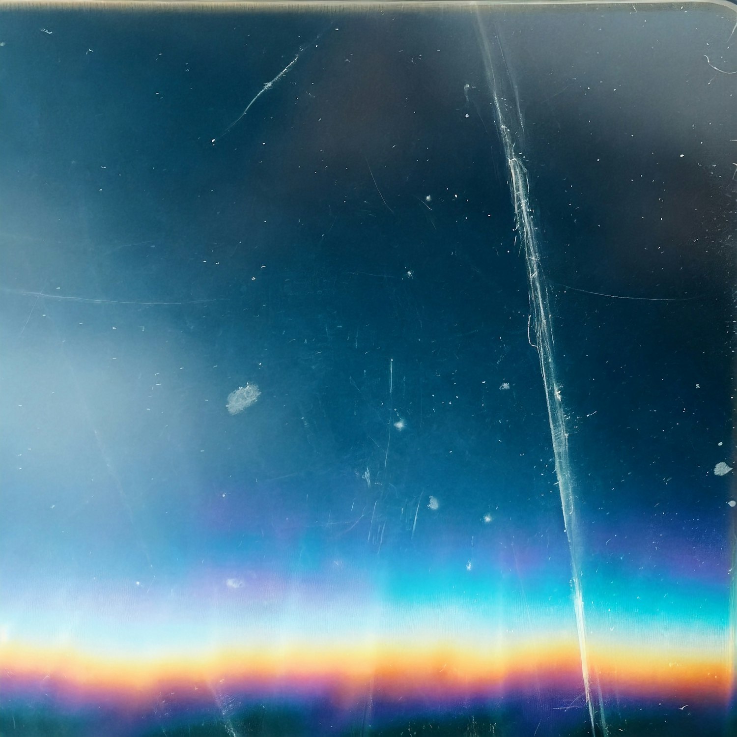 Abstract image with a gradient of blue, purple, and orange hues, resembling a cosmic scene with scratches adding texture.