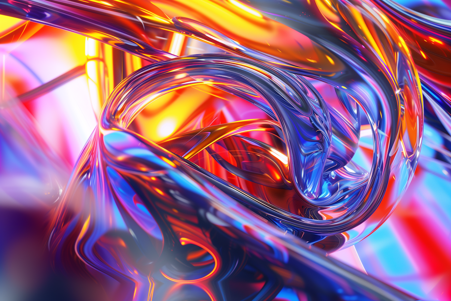 Vibrant abstract image with swirling glossy ribbons in orange, blue, pink, and yellow, creating a dynamic and fluid visual effect.