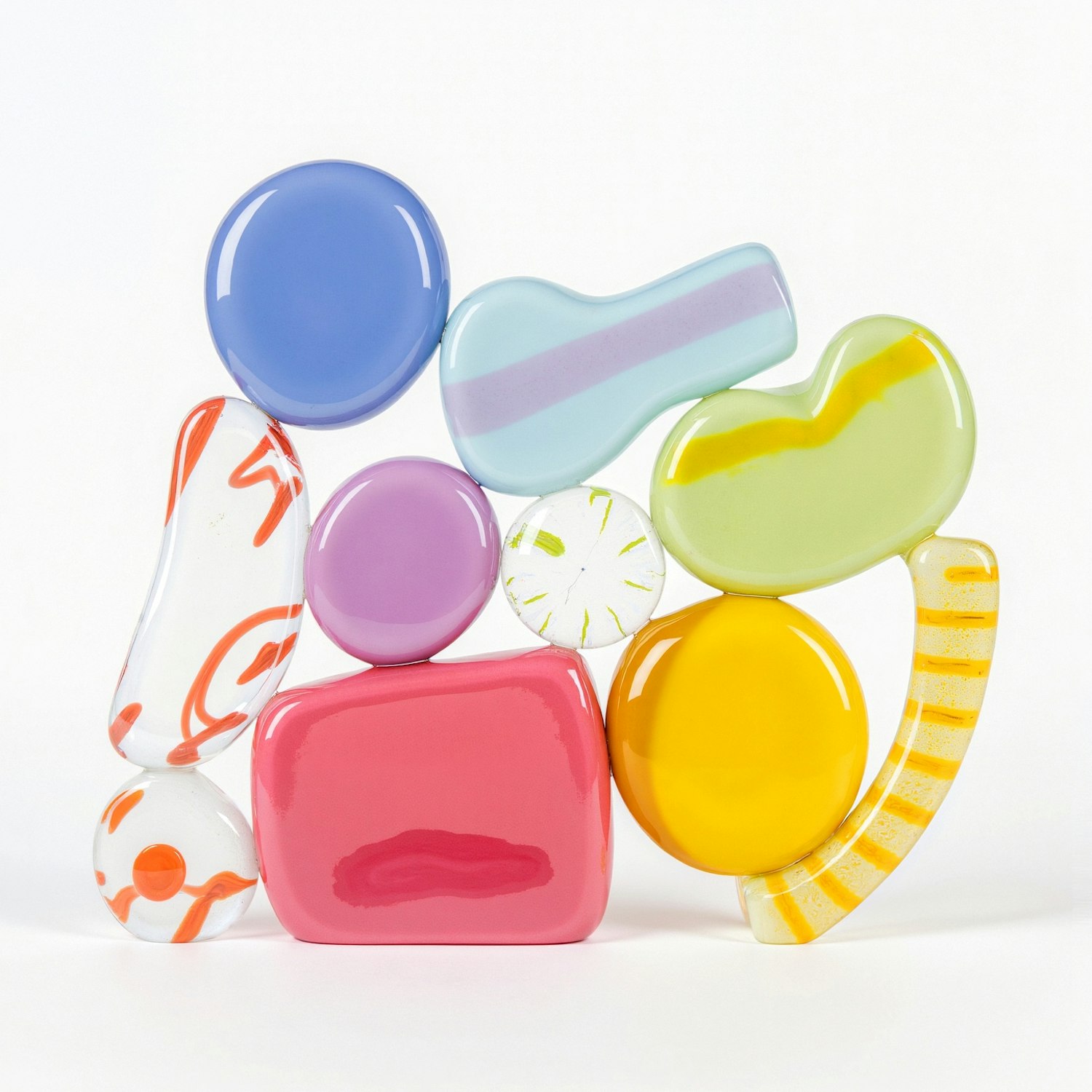 Colorful abstract glass shapes arranged in a playful, balanced composition on a white background.
