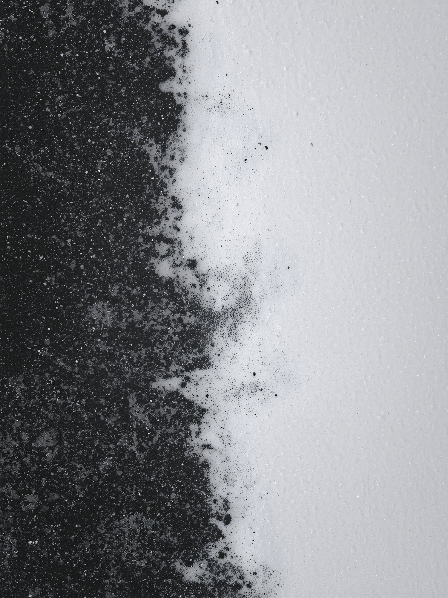 Abstract black and white composition with granular textures and organic transitions, creating a striking visual contrast.