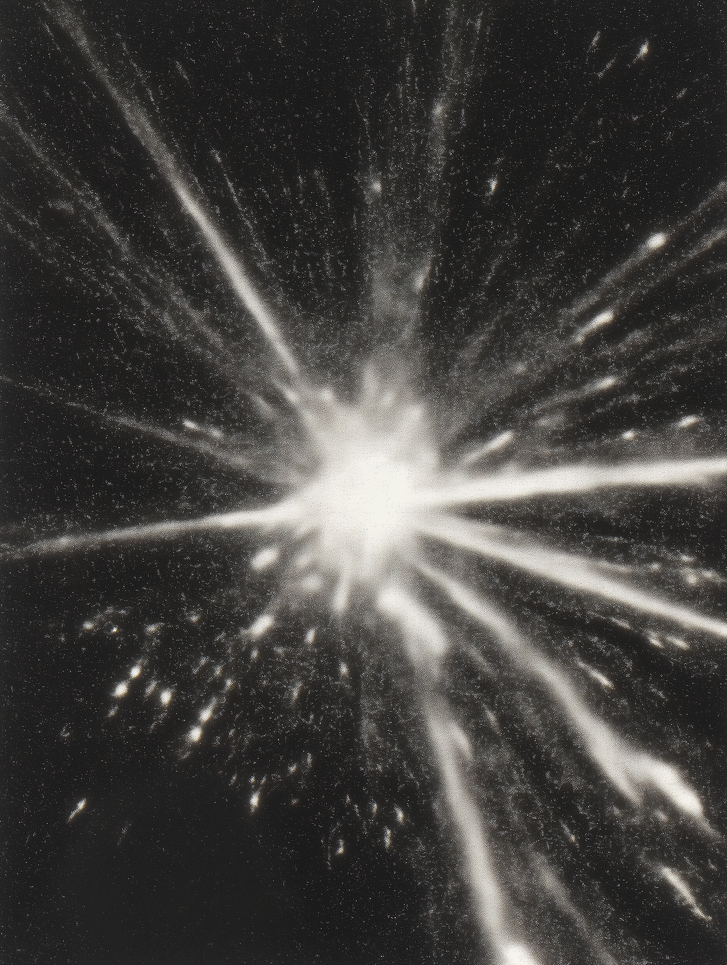 Abstract monochrome image of a bright explosion-like burst with streaks radiating outward against a dark, speckled background.