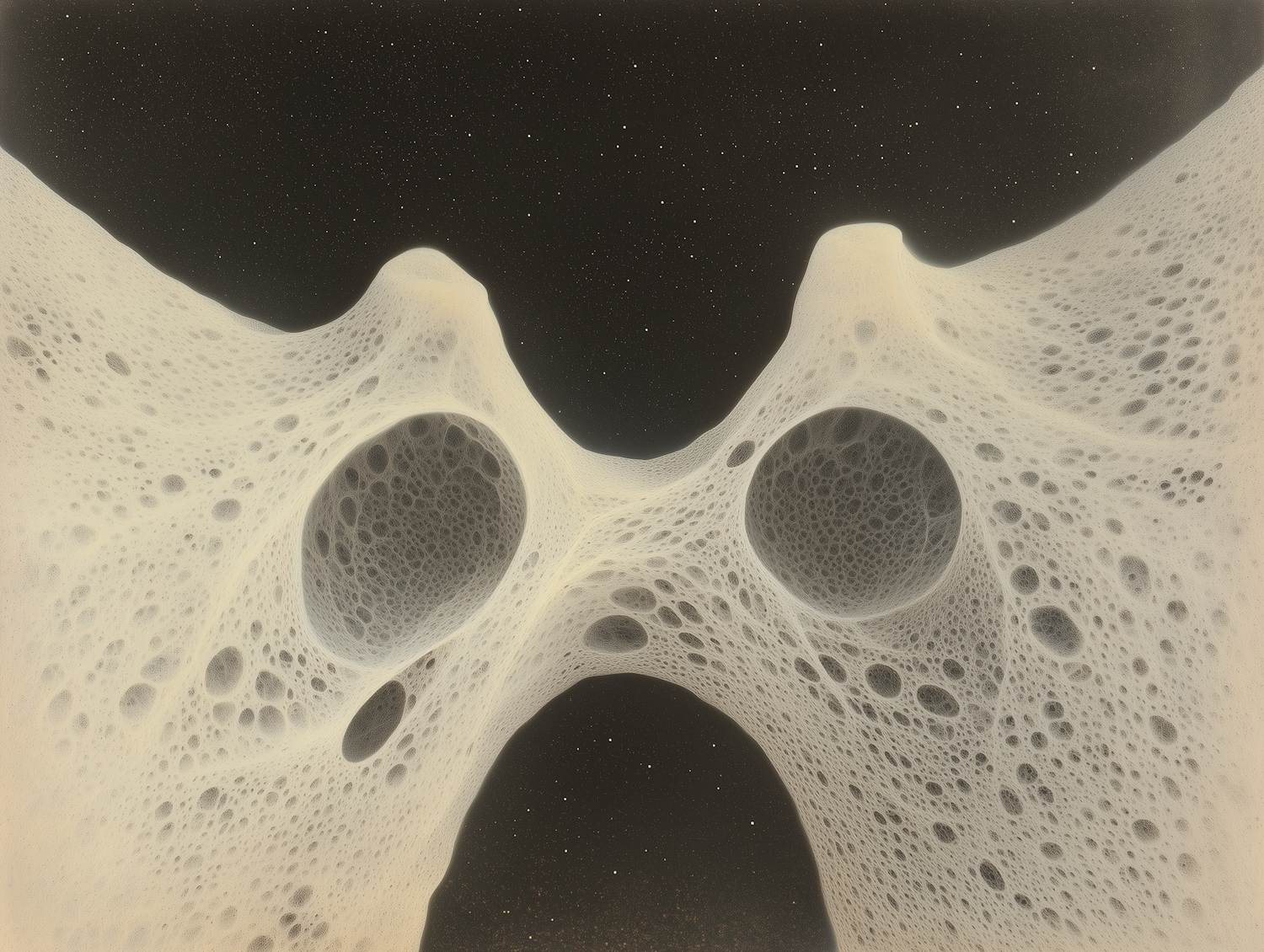 Surreal abstract image of a porous structure against a starry background, blending organic and cosmic elements.