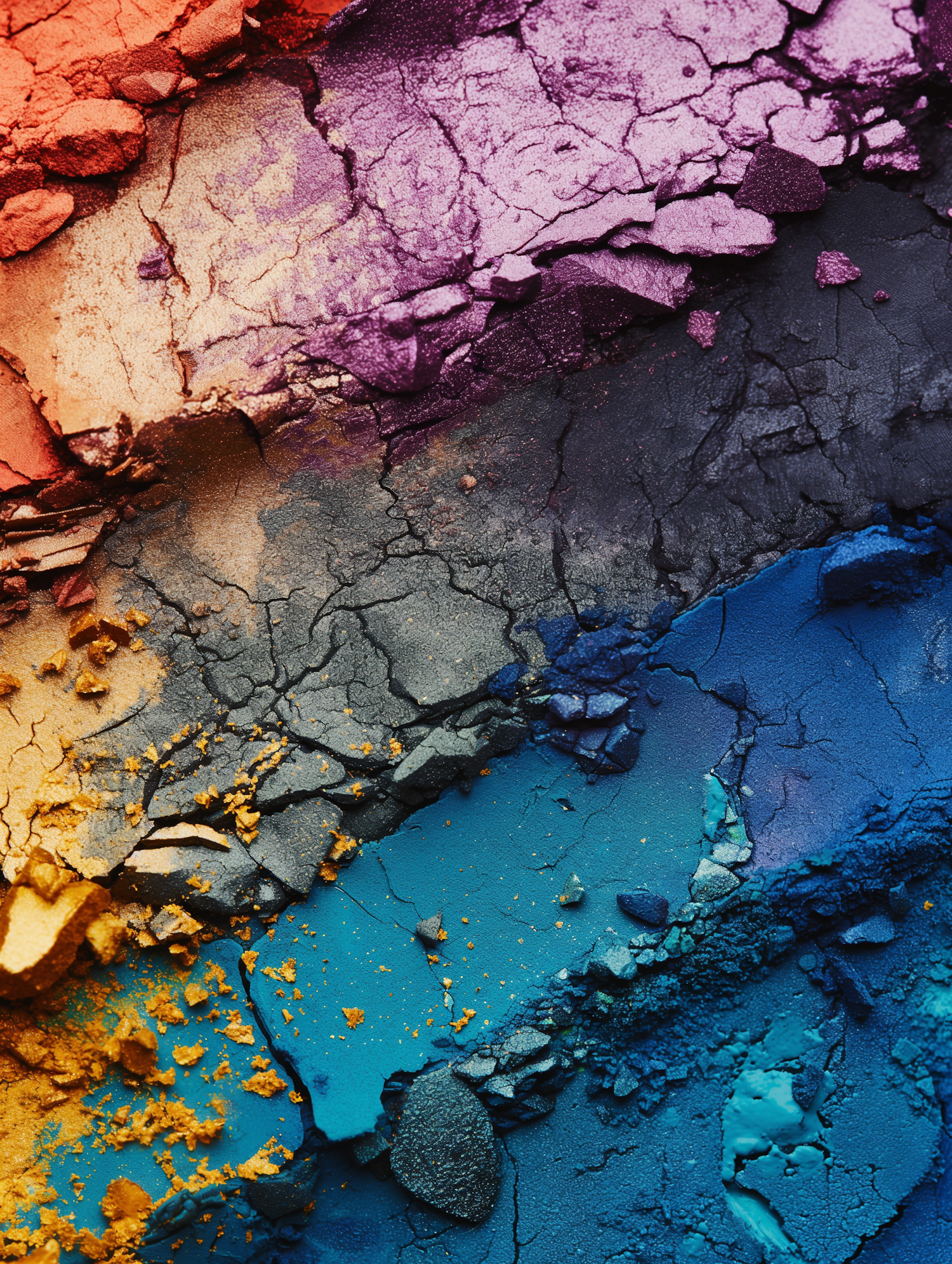 Vibrant crushed pigments in red, purple, black, and blue create a dynamic, textured composition with rich color transitions.