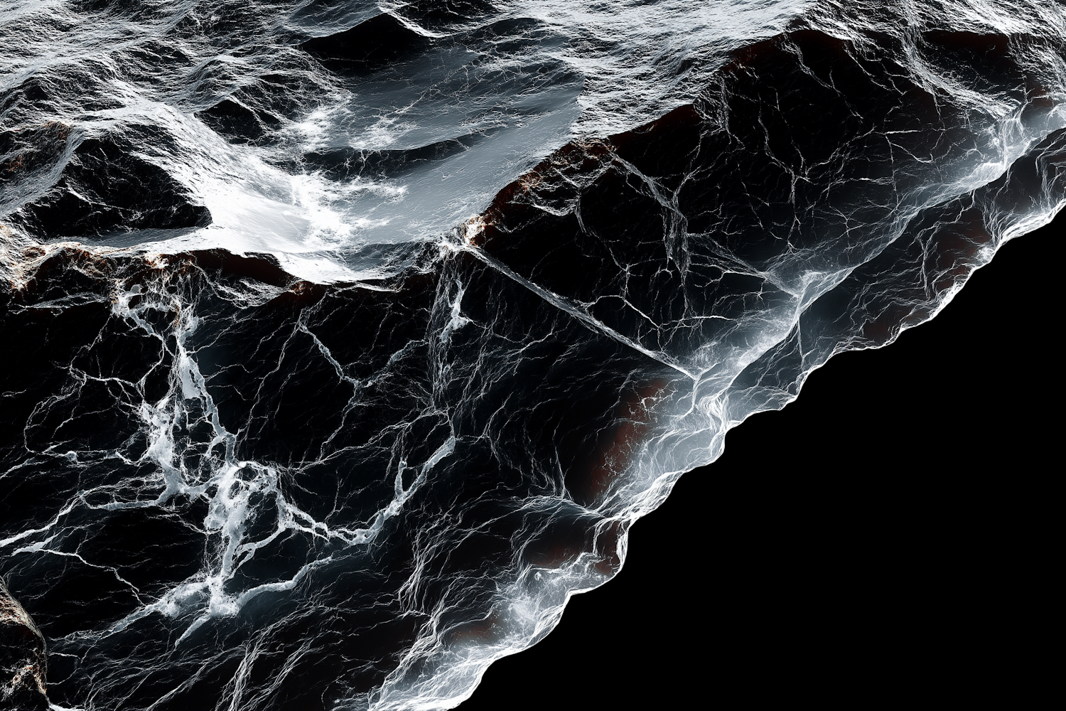 Abstract depiction of a textured surface with intricate white patterns against a dark background, resembling natural fractures.