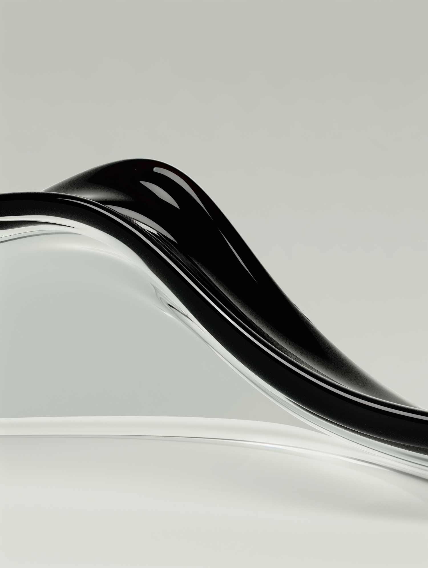 Abstract black curve with glossy finish over a translucent surface, set against a muted gray background. Minimalist and modern design.