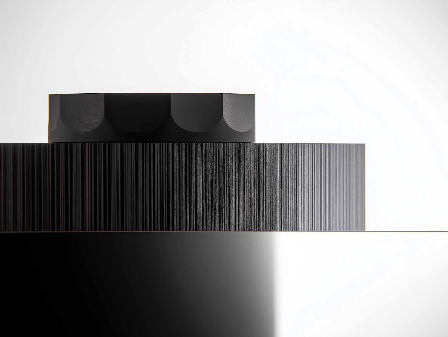 Minimalist black cylindrical shapes with scalloped and ridged textures on a clean white background. Modern and abstract design.