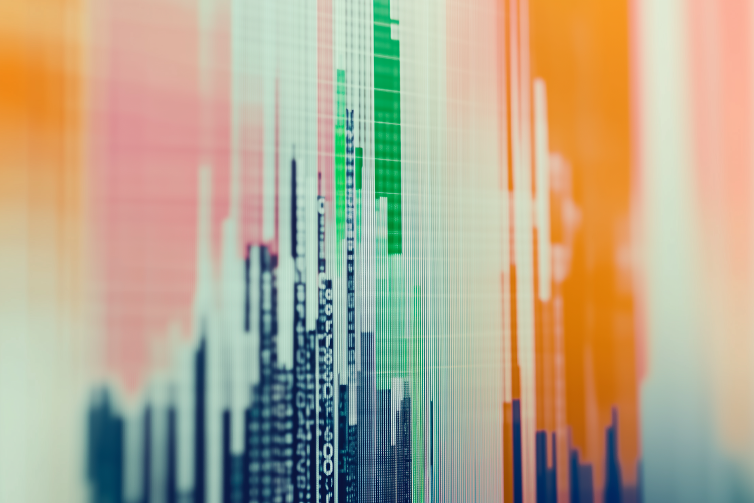 Abstract data visualization with colorful vertical bars and a gradient background, blending orange, pink, green, and blue tones.